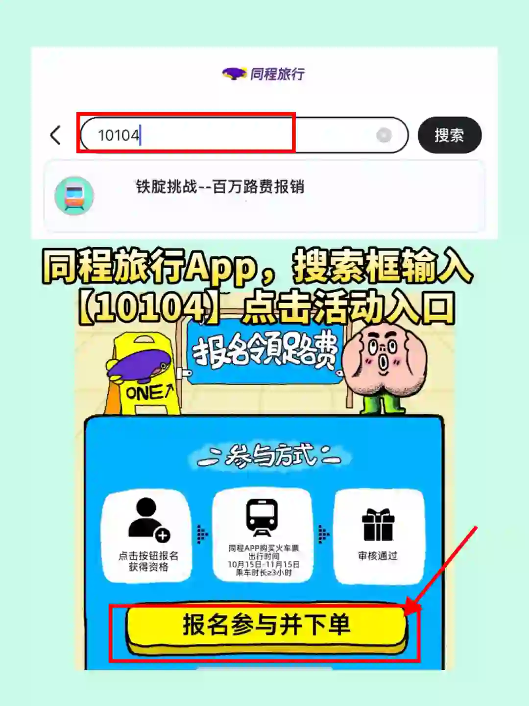 同程旅行App 搜索【10104】就可以找到【铁锭挑战赛】入口!进入后点击报名&下单