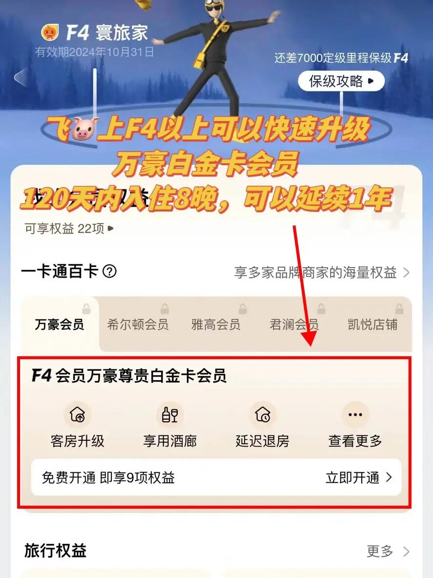 飞🐷F4会员可以匹配万豪白金卡会员,入住8晚即可完成白金会员挑战,延期1年!