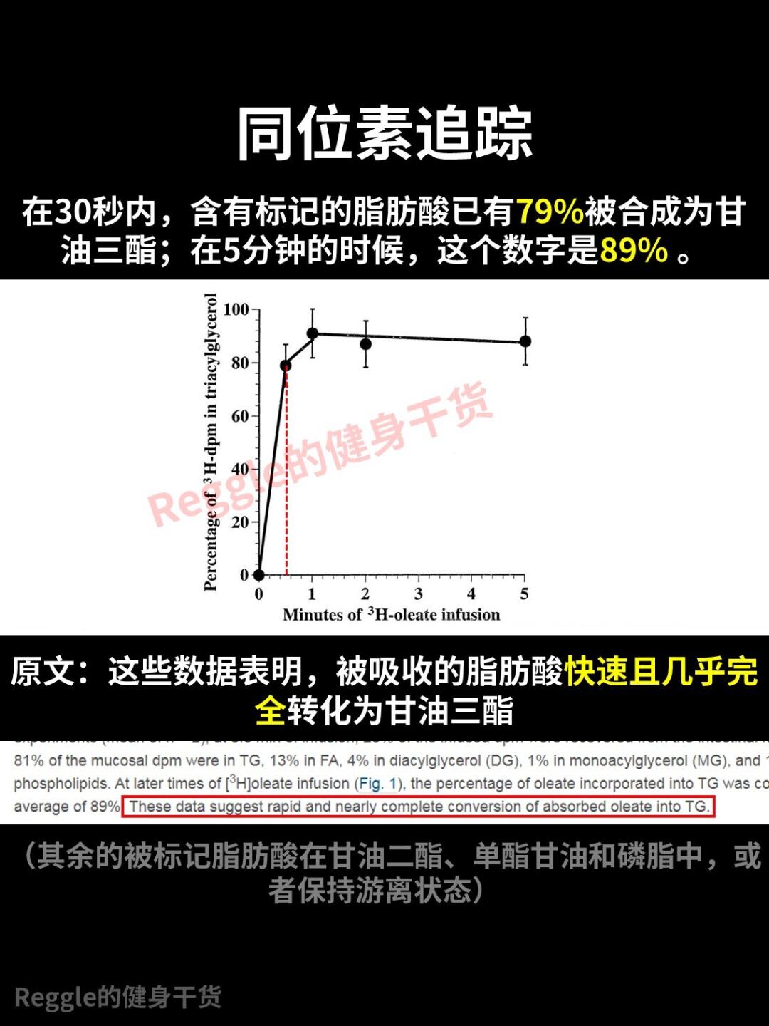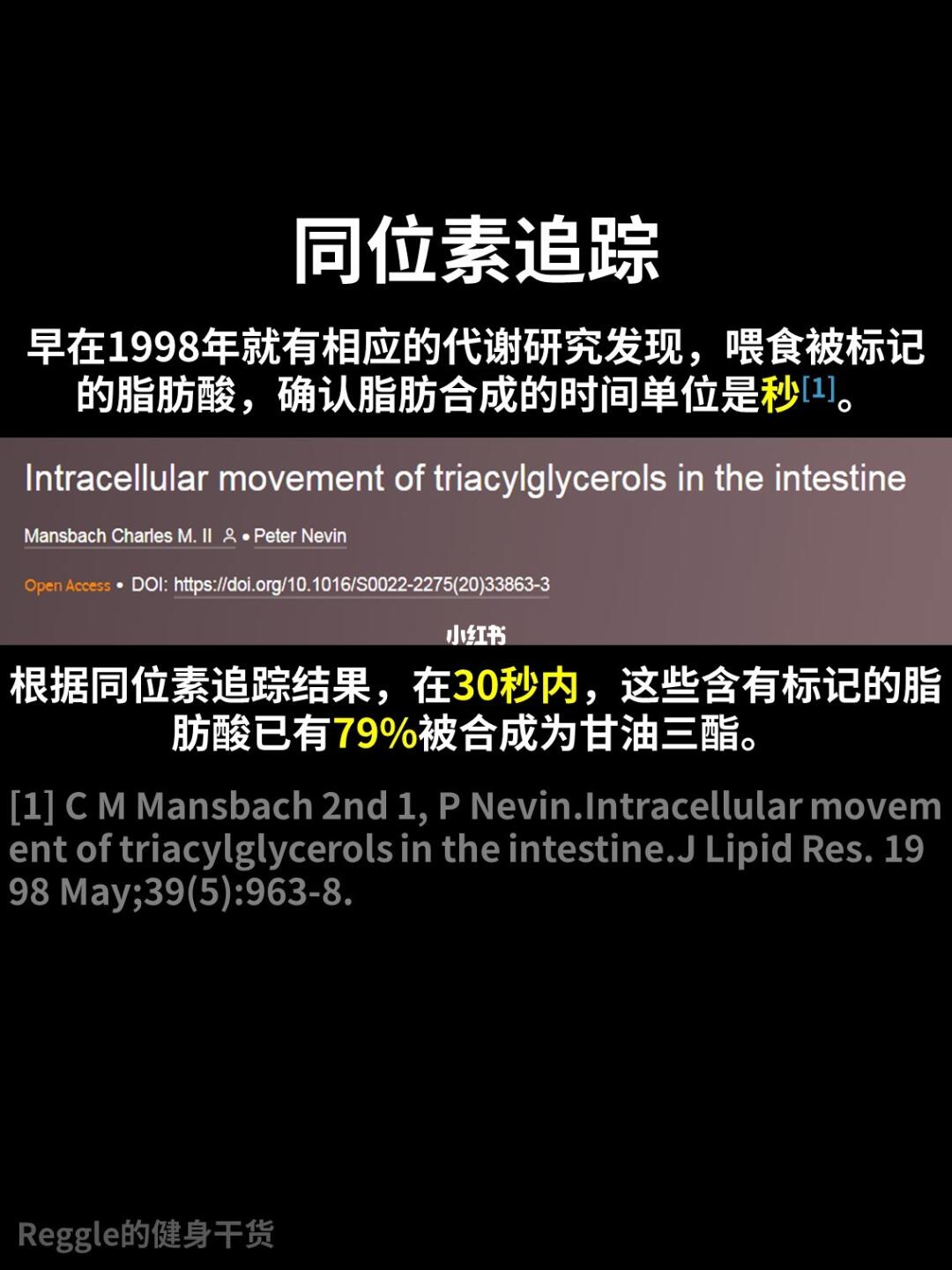 5. 早在1998年就有相应的代谢研究发现,喂食被标记的脂肪酸,确认脂肪合成的时间单位是秒[1],因为根据同位素追踪结果,在30秒内,这些含有标记的脂肪酸已有79%被合成为甘油三酯。