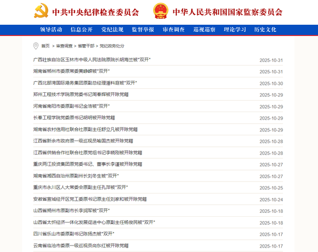 此外还有:广西壮族自治区玉林市中级人民法院原党组书记、院长胡海兰被开除党籍和公职,湖南省农村信用社联合社原党委委员、副主任舒立凡被开除党籍,重庆两江投资集团原党委书记、董事长李谨被开除党籍,大连海关原党委书记、关长刘大立被开除党籍和公职,中国中纺集团有限公司原党委书记、董事长刘云被开除党籍和公职,等等。
