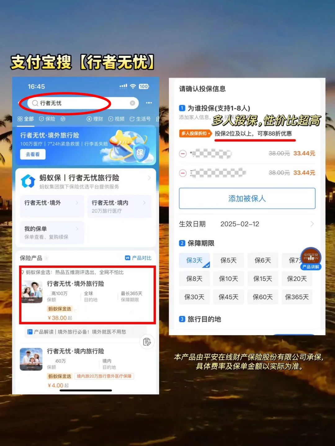 支付宝搜“行者无忧”就能找到了,和家人、朋友一起买,保费还可以打88折!