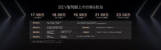 其中,汉DM-i智驾版共推出5款车型,售价16.88万~22.58万元;汉EV智驾版共推出5款车型,售价17.98万~23.58万元,开创B+C级轿车全民智驾,加配不加价!