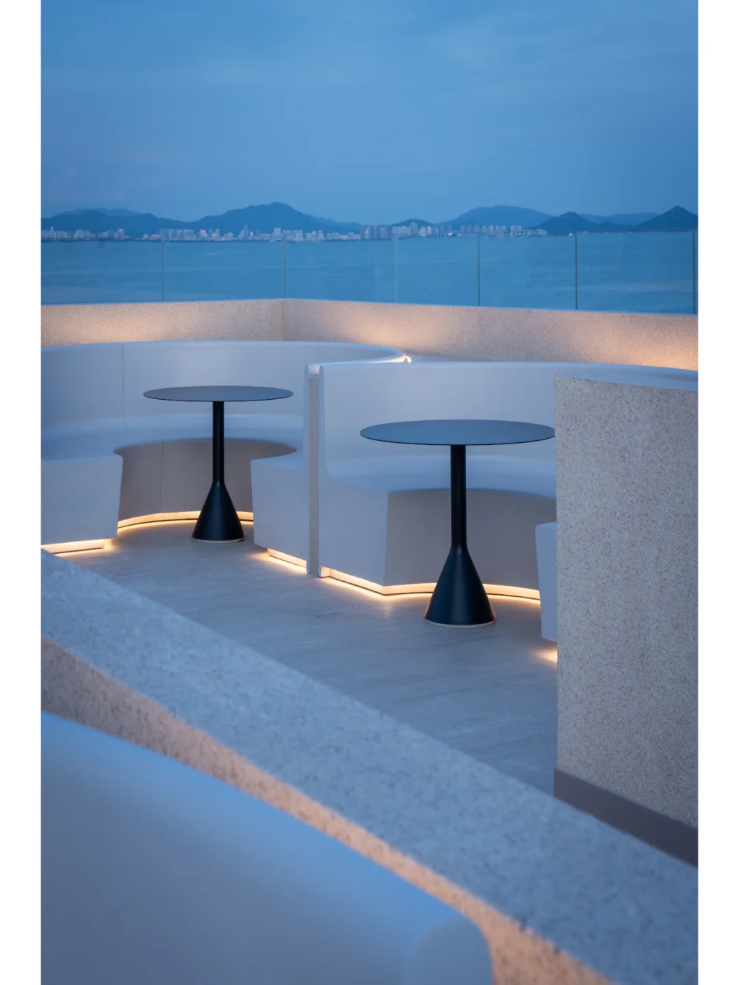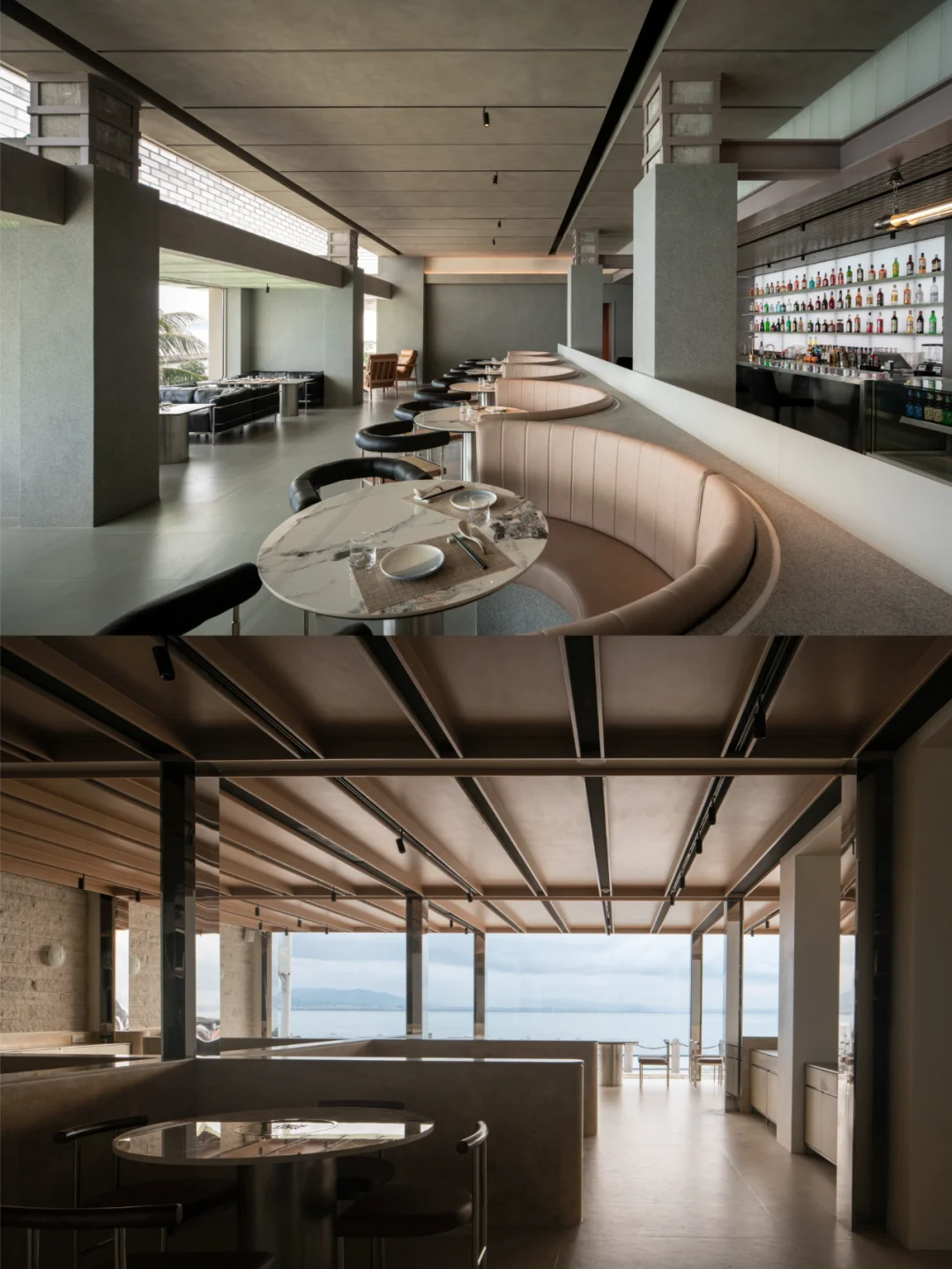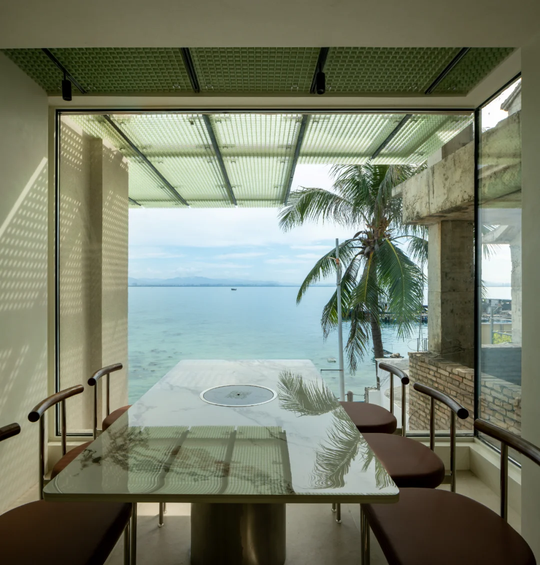 所以设计上,尽量把海景优势放大,面向海的立面尽量只有玻璃,把一切可能干扰的装饰因素统统去掉,同时室内座位的布置都平行于大海,让在座的客人尽可能的享受海景;天花系统强调垂直大海的线条,方便梳理天花管线的同时,也加强空间冲向海面的指向性。
