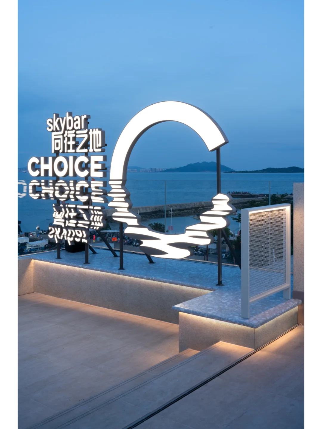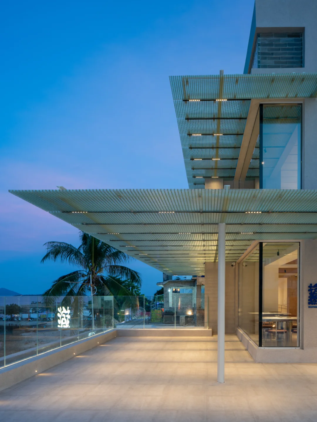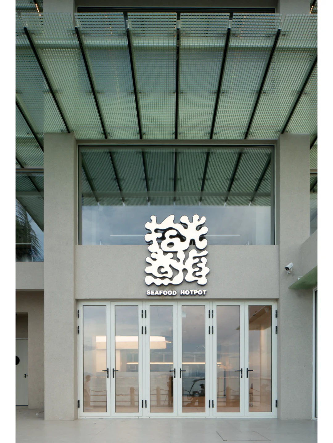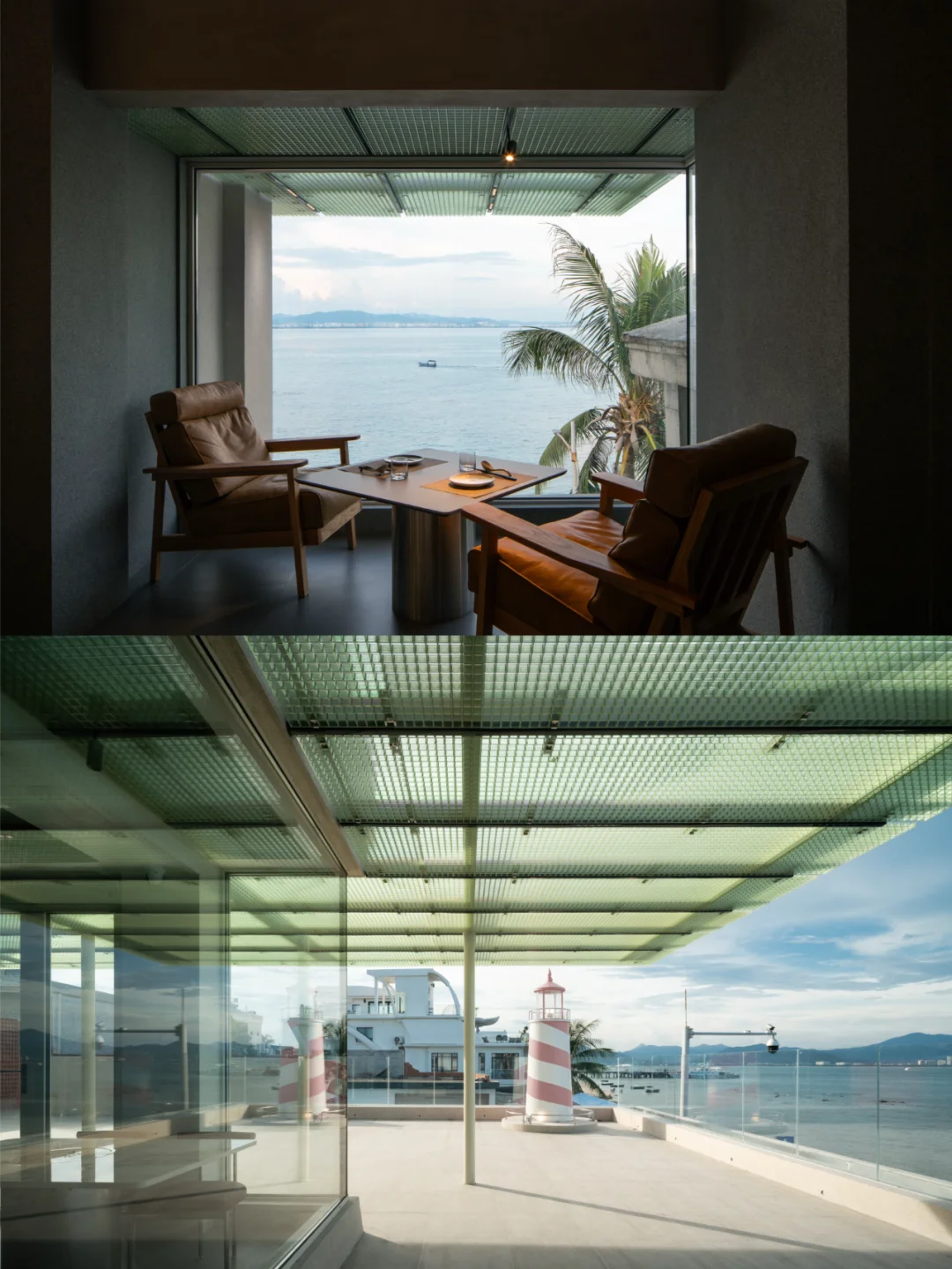所以设计上,尽量把海景优势放大,面向海的立面尽量只有玻璃,把一切可能干扰的装饰因素统统去掉,同时室内座位的布置都平行于大海,让在座的客人尽可能的享受海景;天花系统强调垂直大海的线条,方便梳理天花管线的同时,也加强空间冲向海面的指向性。