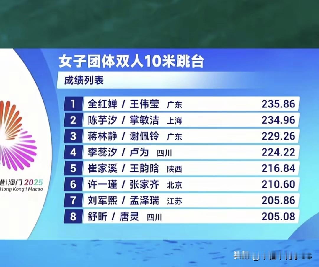 全红婵伤愈回归首秀就夺金,实力打脸质疑者! 2025年全运会跳水女子团体项目,全红婵伤愈之后第一次比赛,之前她因为脚踝旧伤复发退出全国冠军赛,腰部劳损又错过了世锦赛,大半年没比赛,还有人吐槽她身材发福。 这次和王伟莹搭档在比赛里,她俩第一跳就拿了76.50分的全场最高分,后面两轮更是拿到78.72分、80.64分直接以235.86分锁定第一助力广东队以2369.8分卫冕跳水女子,狠狠回应了外界的质疑。 不过可惜的是,这么厉害的她退出了女子单人10米台的比赛,多少有点遗憾。但不管怎样,全红婵这实力是真的没话说,期待她后续更多精彩表现!