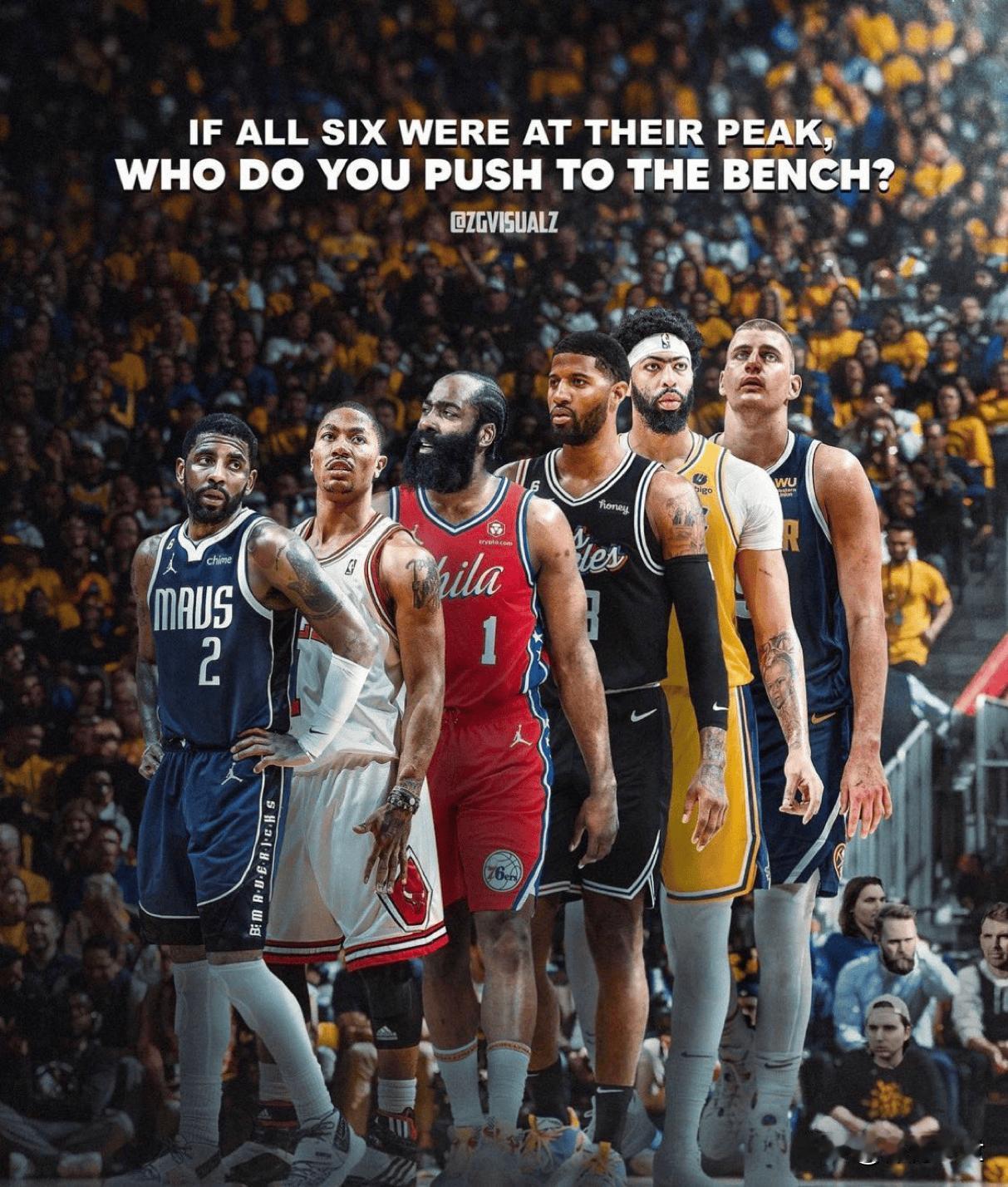 欧文、哈登、保罗乔治、戴维斯、约基奇谁会下一个去打替补还真不好说。 欧文生涯第9次入选全明星,实力一直在线,目前独行侠阵容里他是核心之一,打替补可能性小。 哈登本赛季再次跻身全明星名单,在球队也有重要地位,不过随着年龄增长,若球队战术调整,也有打替补可能。保罗乔治伤病影响状态,若球队为平衡阵容,说不定会让他替补。 戴维斯刚交易到独行侠,之前一直是核心,短期打替补概率低。 约基奇是掘金绝对核心,带队能力强,基本不可能打替补。 感觉哈登和保罗乔治打替补的几率相对大一些。