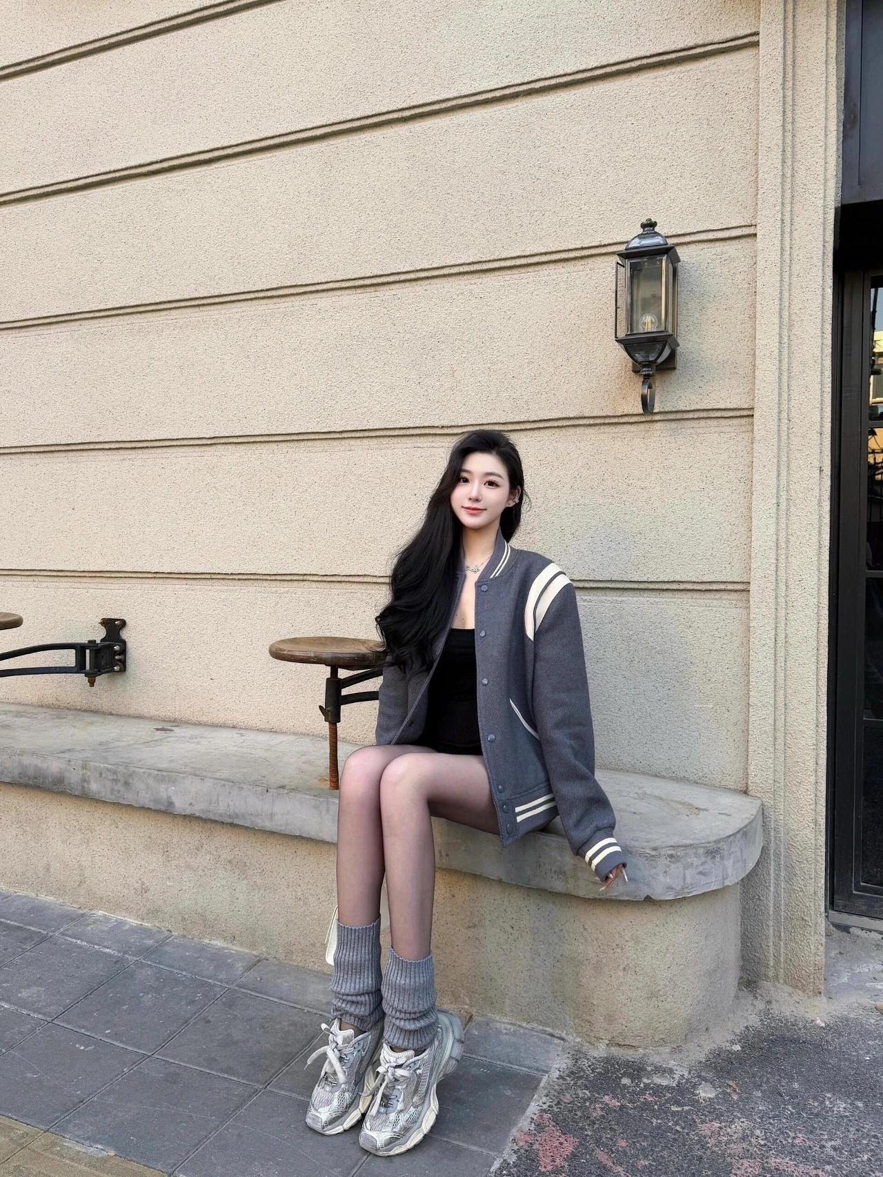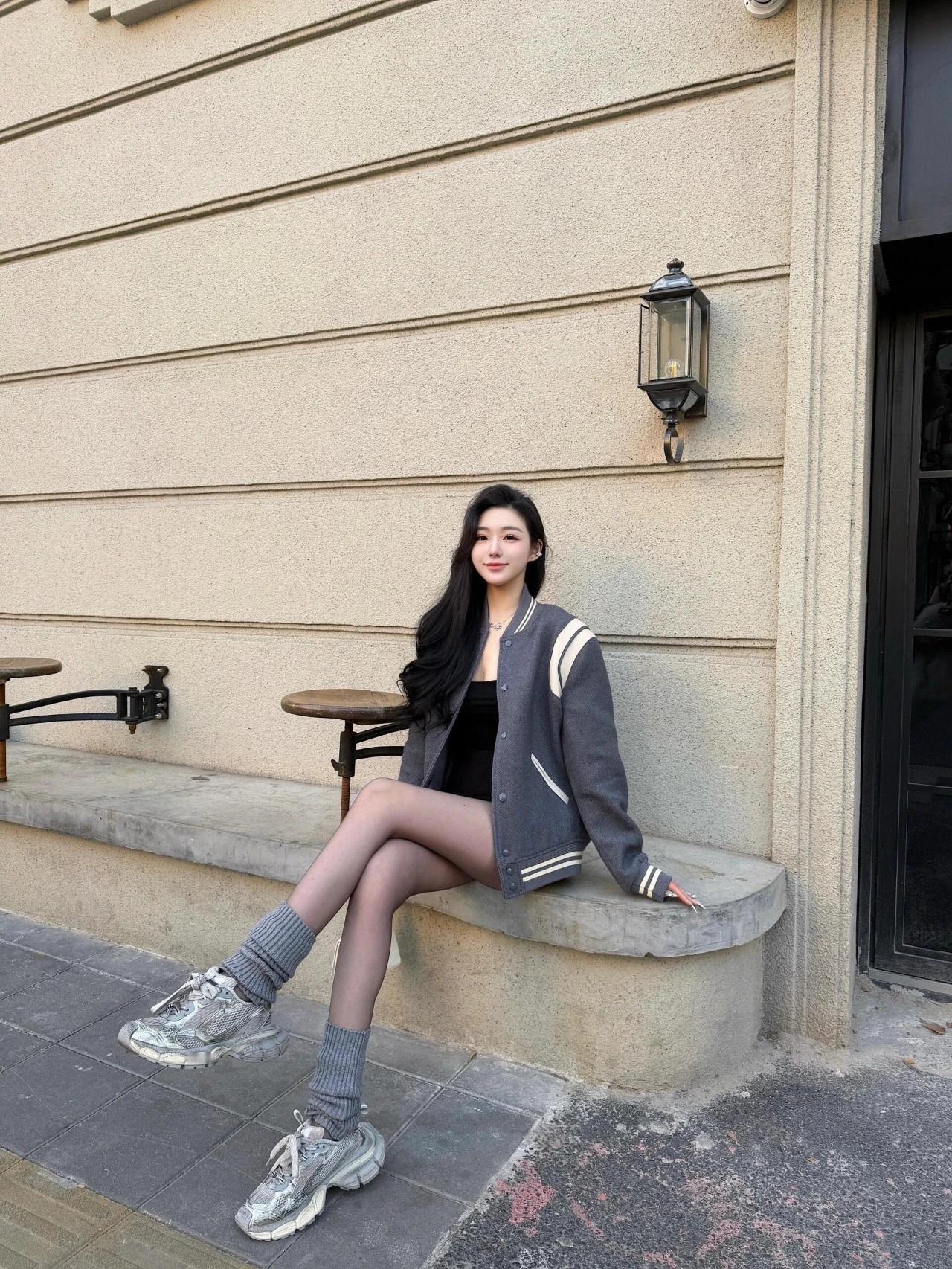 棒球服+短裤配丝袜,秋冬完美穿搭