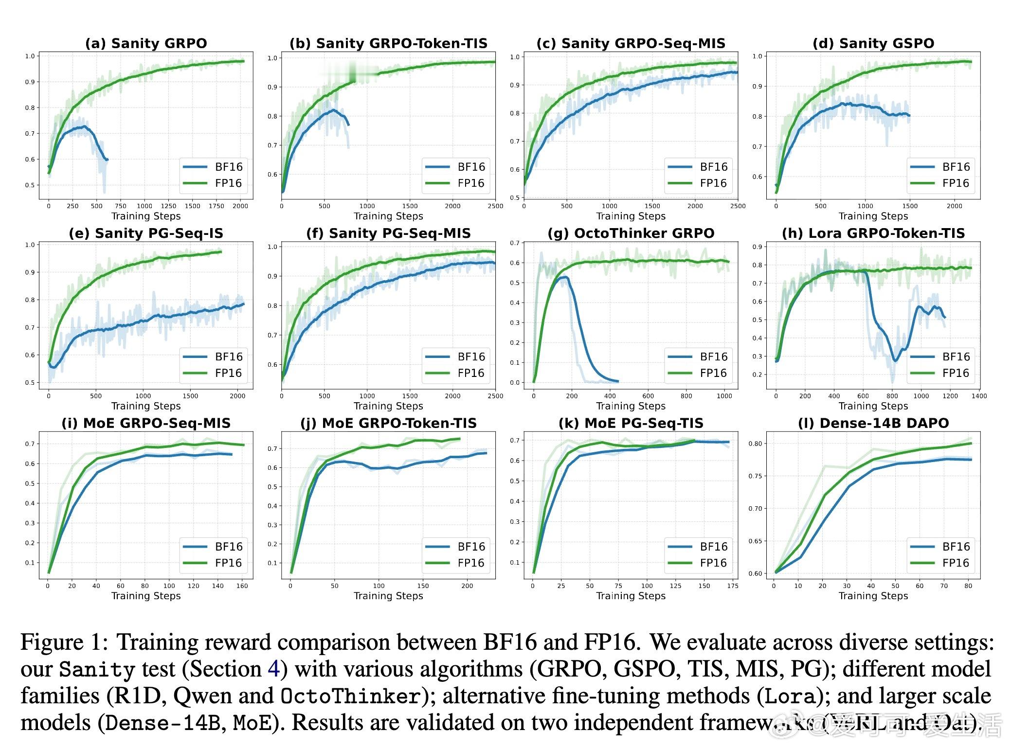 作者提出一个简单但颠覆性的解决方案:将训练和推理的数值格式从BF16切换回FP16。FP16拥有更多的尾数位(10位对比BF16的7位),精度显著提升,极大降低了训练推理间的数值差异。这一改变不需改动模型结构或训练算法,只需少量代码修改,即可实现。实验覆盖多种算法(GRPO、GSPO、PG等)、模型结构(Qwen、OctoThinker、Dense-14B、MoE)、以及不同训练框架(VeRL、Oat),均显示出FP16带来的训练稳定性提升、收敛速度加快和性能增强。