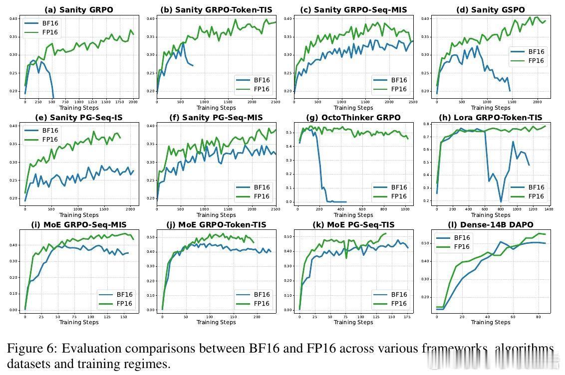 此外,本文创新性地设计了“完美可提升数据集”作为“理智测试”,剔除过易或过难题目,精准评估RL算法的可靠性。结果证明,使用BF16时多数算法训练不稳定甚至崩溃,而FP16下所有算法均表现优异且差异缩小,说明数值精度是影响训练稳定性的关键因素。
