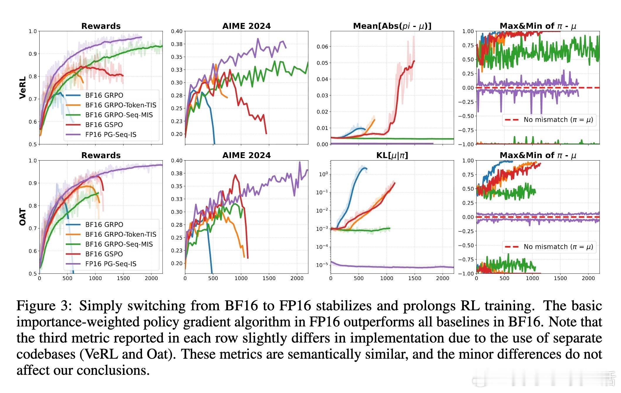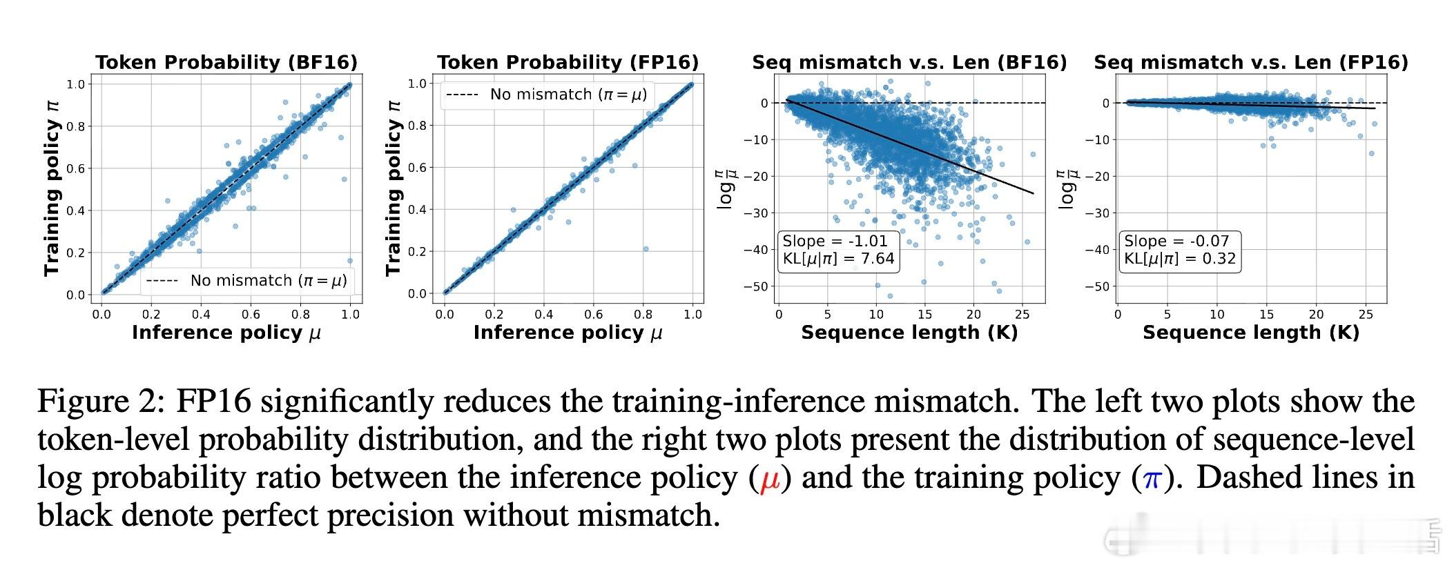 - 切换到FP16大幅提升数值精度,几乎消除训练-推理不匹配