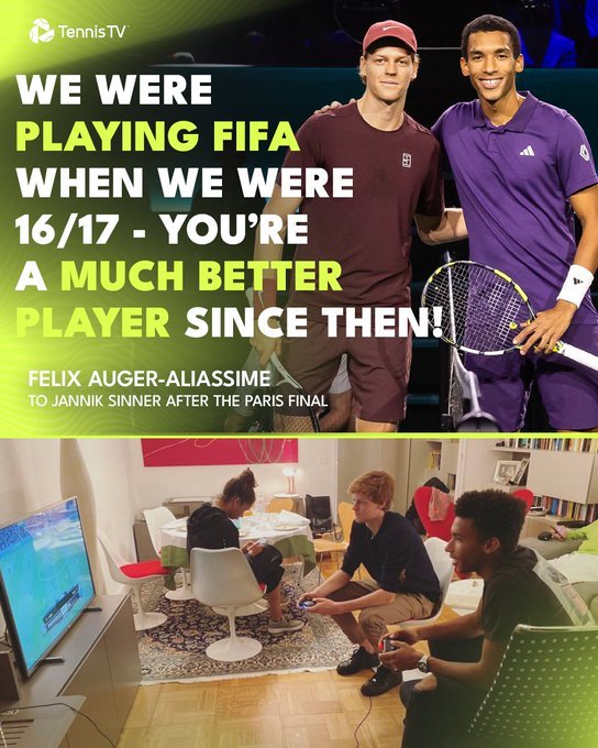 巴黎大师赛决赛4比6和6比7败阵的阿利亚西姆,颁奖仪式上说道:“我们十六七岁还一起打过FIFA游戏呢,你在那之后所取得的所有进步,我只能向你脱帽致敬。”