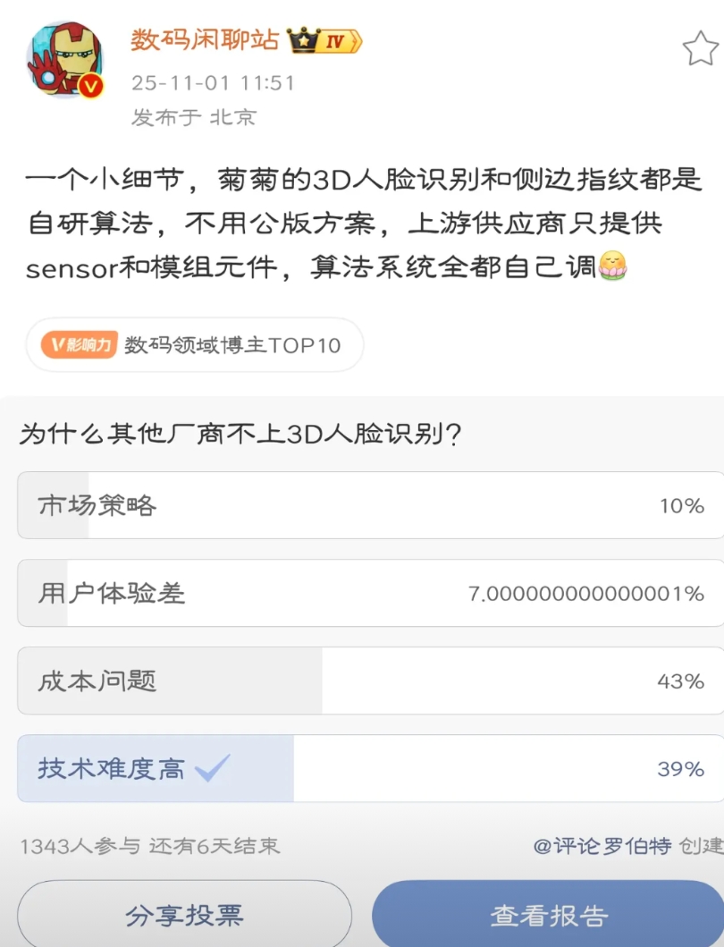 华为3D人脸识别算法最近才用自研算法吗? 华为的3D人脸识别不是从mate30系列的结构光开始算法就是自研的吗?怎么有博主最近又提自主3D人脸识别算法呢? 一直以来就华为mate系列和苹果手机在用3D人脸识别,要想体验就只能二选一了。 3D人脸识别用起来真是爽,特别是在支付的时候。我的mate70Pro已经很少用指纹识别了,一个3D人脸识别已经足够了。 那么问题来了,为什么其他友商不用3D人脸识别呢?技术问题,还是成本问题呢?供应商已经解决了技术问题,那么就是成本问题占大头了。