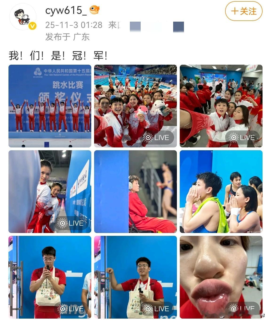11月3日凌晨,跳水运动员陈艺文发文说:“我们是冠军!” 简简单单5个字,她是在为广东跳水队加油打气,这是夺冠后的喜悦。她还发了9张图,有4张图里面能看到全红婵。 陈艺文是全红婵的知心姐姐,她比婵妹大8岁,她俩关系特别好。 大家都说全红婵长胖了,长胖了又怎样,没长胖又怎样,这都是身体发育的正常现象。运动员这么辛苦,只要能跳出好成绩,什么都无所谓,大家觉得呢?