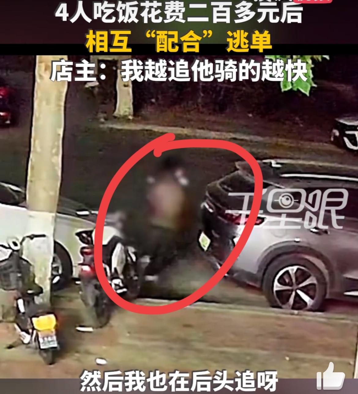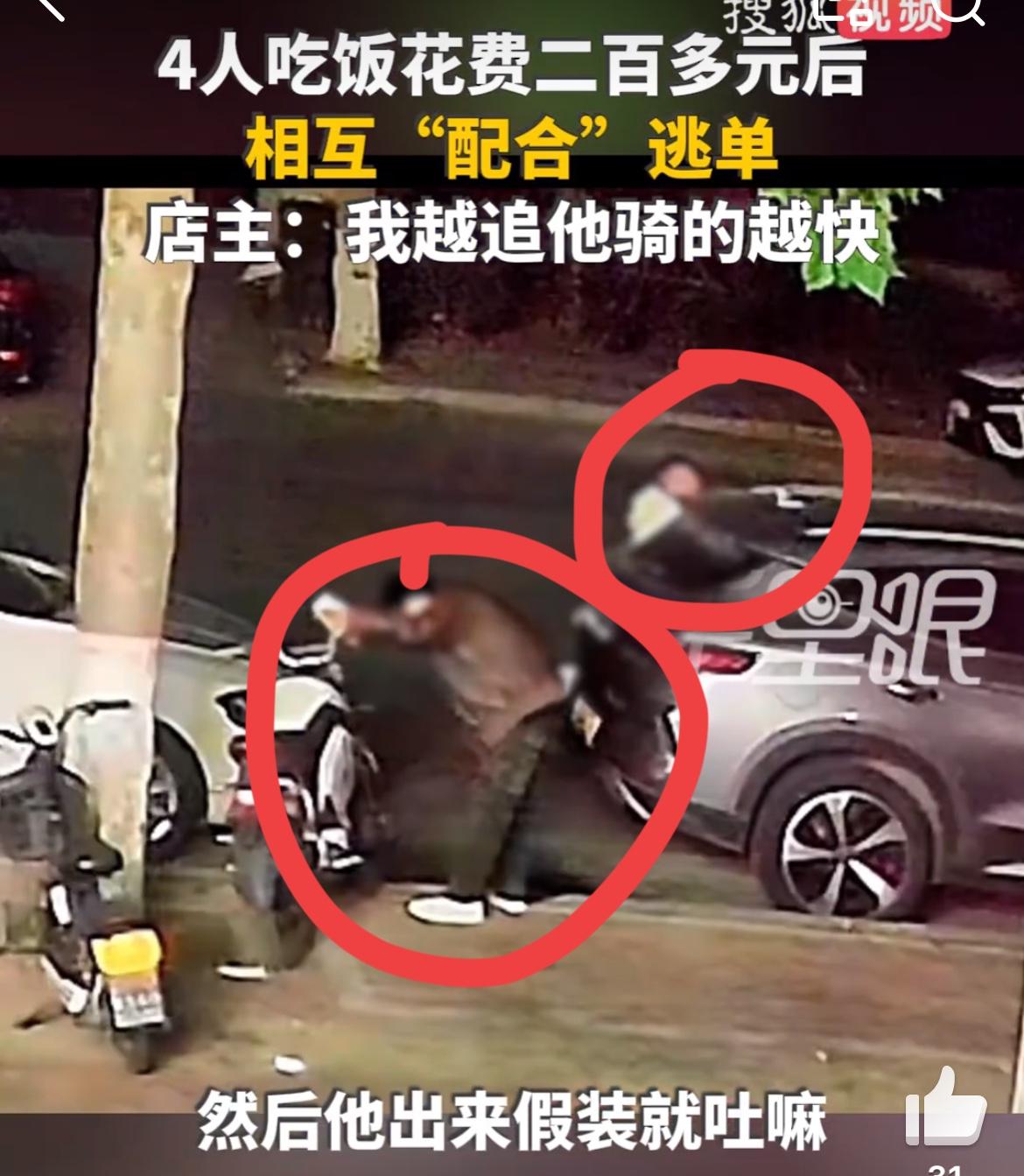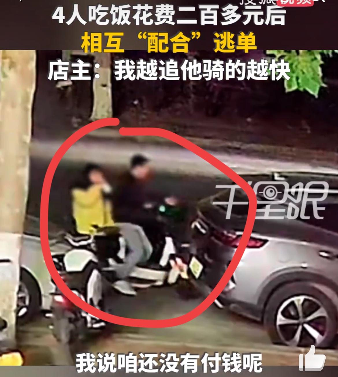 两对俊男靓女吃饭不付钱,上演教科书般的逃单技巧,店家追了上百米无果。事发河南鹤壁,四人在一餐馆吃了200多块钱,一对男女先行离开,店家以为剩下的两人付款,没有在意。这时另外一个女滴也走出大门,骑电瓶车藏在车背后,男子假装喝醉跑到门口大树下呕吐,趁店家不注意登上等候的电瓶车一溜烟跑了。饭店逃单 餐饮店逃单 自助餐逃单 硬核逃单