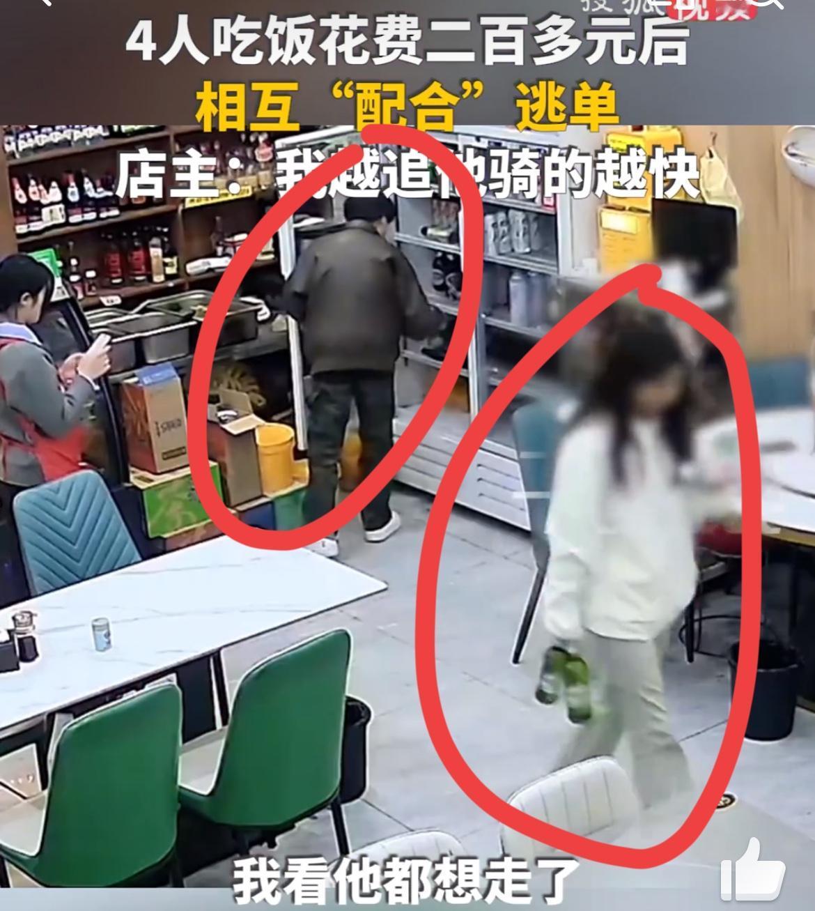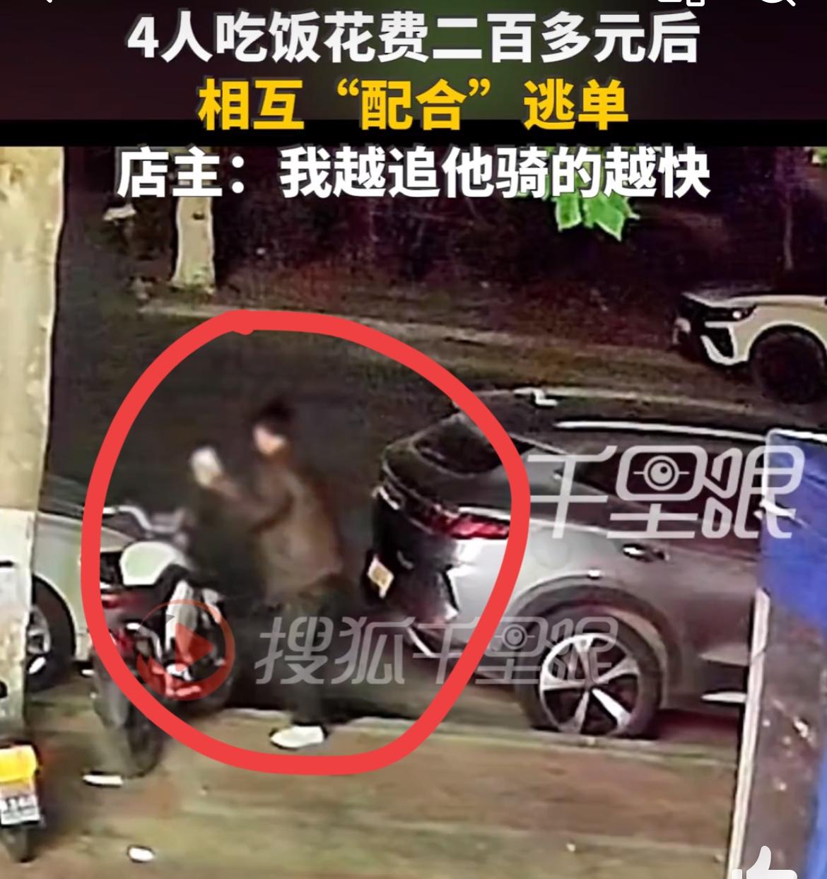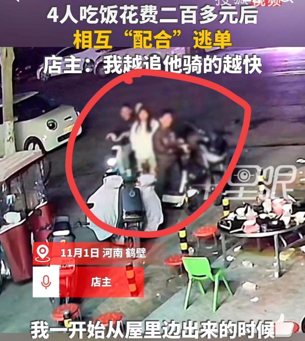 两对俊男靓女吃饭不付钱,上演教科书般的逃单技巧,店家追了上百米无果。事发河南鹤壁,四人在一餐馆吃了200多块钱,一对男女先行离开,店家以为剩下的两人付款,没有在意。这时另外一个女滴也走出大门,骑电瓶车藏在车背后,男子假装喝醉跑到门口大树下呕吐,趁店家不注意登上等候的电瓶车一溜烟跑了。饭店逃单 餐饮店逃单 自助餐逃单 硬核逃单