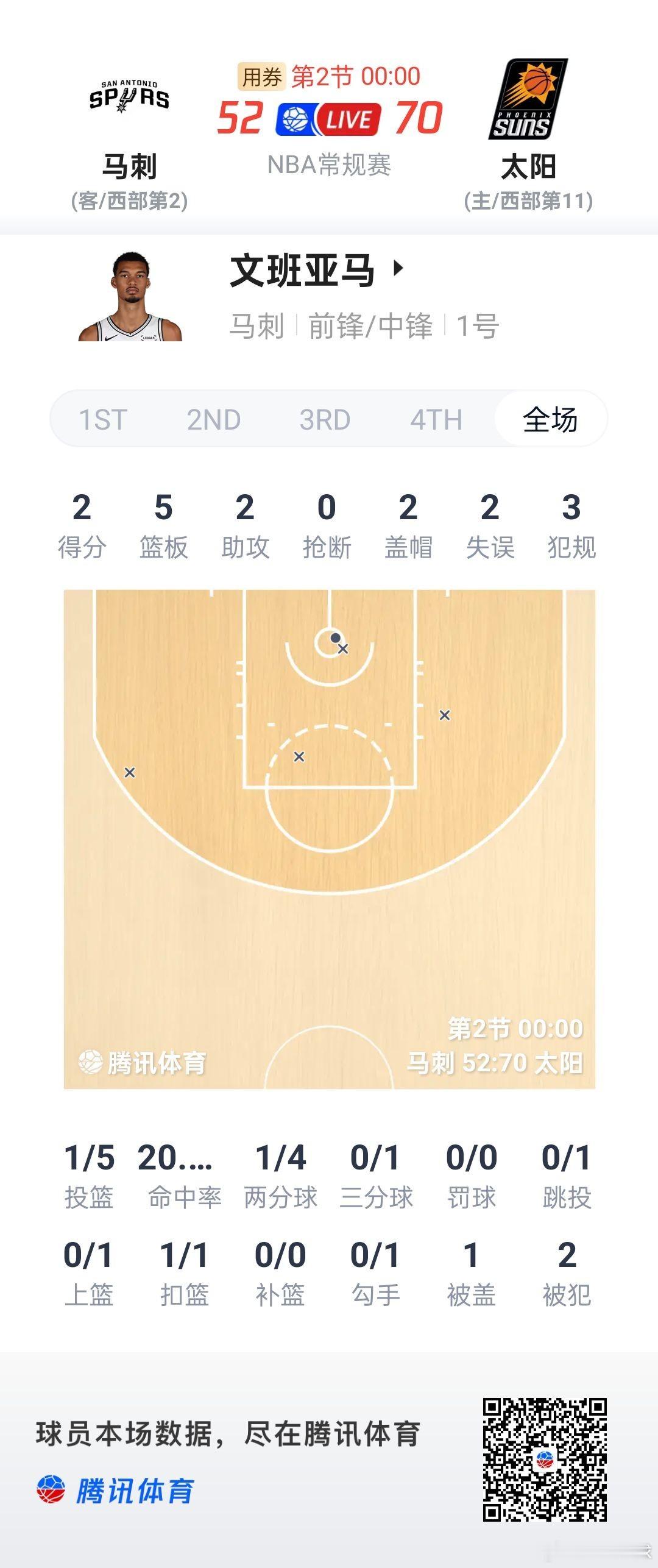 文班亚马开赛以来最差上半场,5投1中,2分5篮板2盖帽2助攻2失误3犯规……
