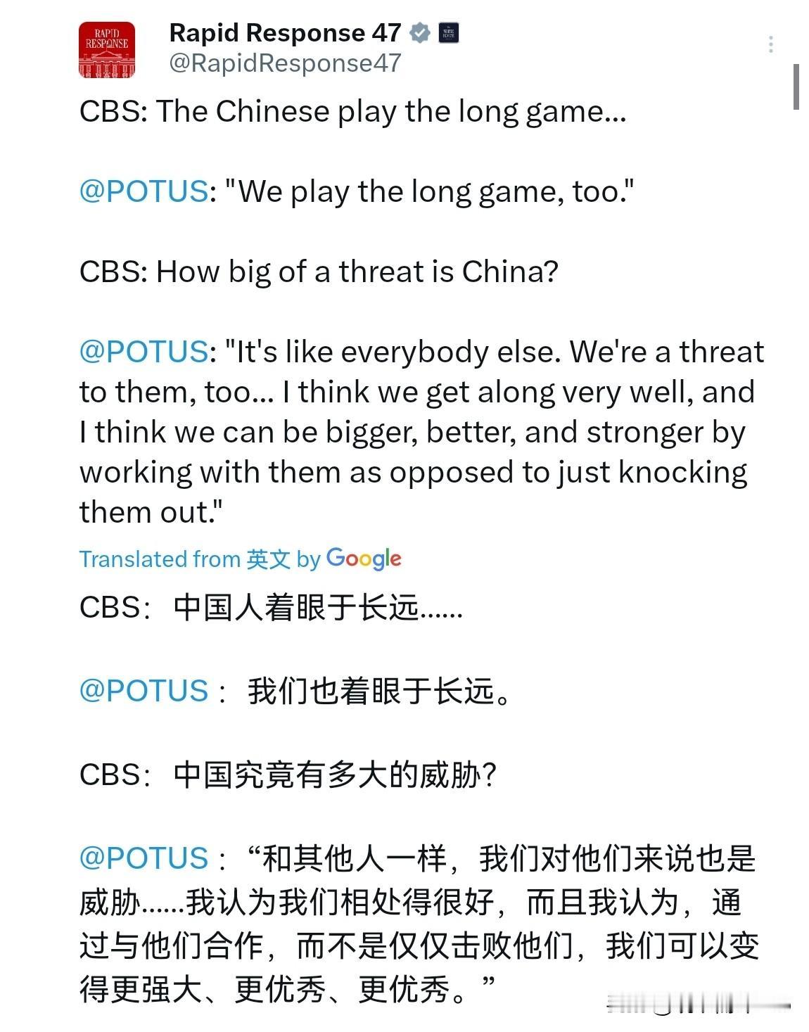 特朗普的这种直率风格,还真是让人讨厌不起来,特朗普直言,美国也是中国的威胁,中美可以合作!11月3日,哥伦比亚广播公司采访特朗普表示:中国人是在打持久战,中国人更加放眼于长远。 特朗普表示,我们也在放眼于长远! 主持人问道:中国的威胁有多大? 特朗普则表示,就像其他人一样。我们对他们也是威胁。我认为我们相处得很好,我认为通过与他们合作,而不是仅仅把他们打倒。我们可以做得更大、更好、更强! 不得不承认,就特朗普这一问一答,这比其它虚伪的美国政客真是强太多了。美国国内政客总一口咬定,中国是美国的威胁,什么问题都是因为中国。但没想到特朗普倒是直言不讳的表示,美国也是中国的威胁。特朗普能够道出这个真相,这还是挺好的,这最起码有助于美国高层在作出决策的时候意识到一点,那就是中美不合作,结果必然是互相伤害,而威胁一定是双向的。 特朗普表示,要通过与我们的合作,让美国更大、更好、更强,这样的表态,这说明中美会晤,我们的话,美国确实听进去了。那就是中美可以相互成就,中国的崛起,不影响美国的伟大。当然,特朗普的态度是说变就变,更重要的无疑就是美国要怎么做。但能当着美国媒体的面,承认美国是中国的威胁,而中美是能够合作的,特朗普这一番话,值得赞赏!