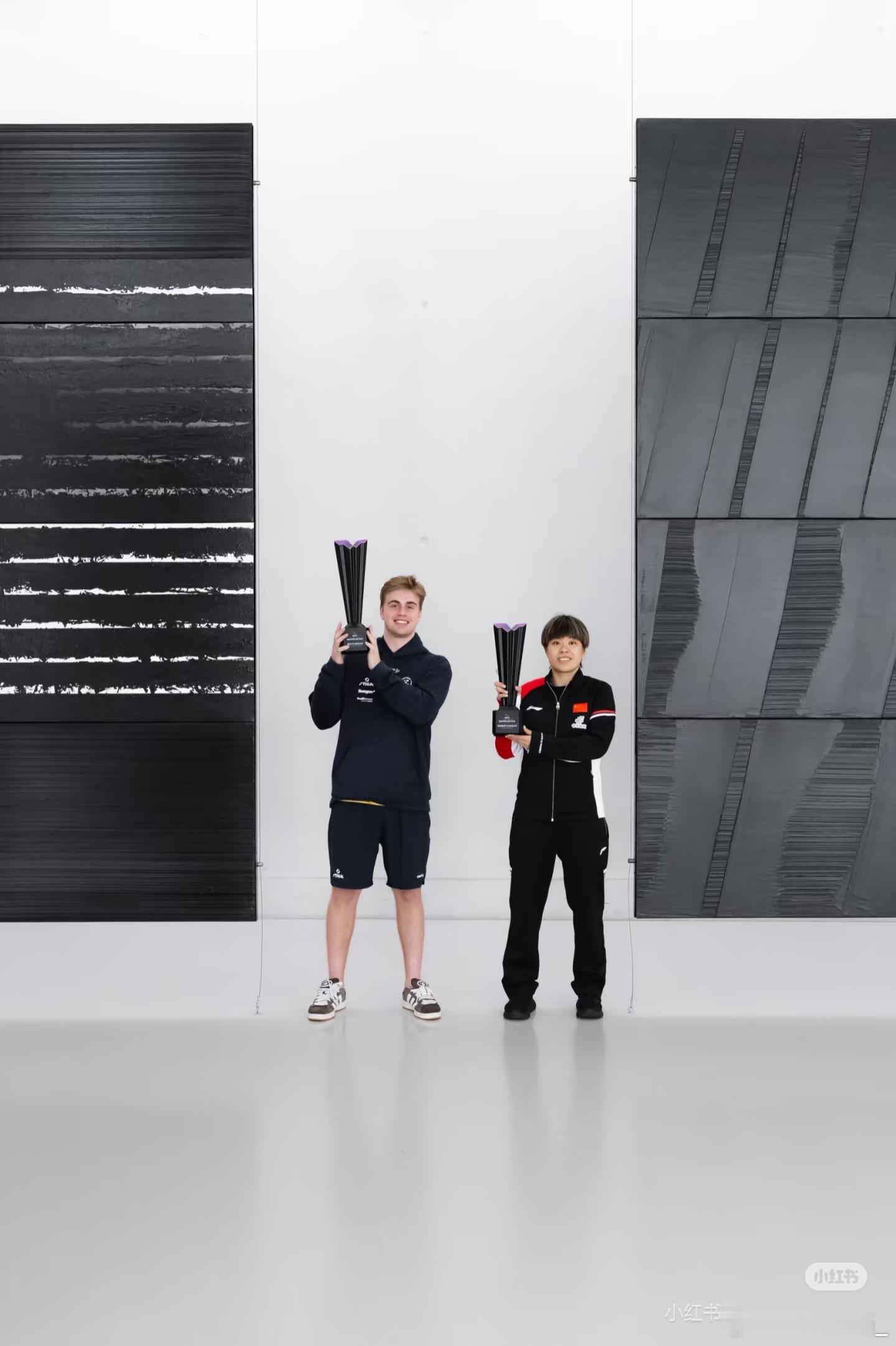 大迪刚扛着压力逆转夺冠,小莫也拿下生涯首个冠军赛奖杯,都是拼尽全力的赢家。合影时一个单手举杯,一个双手捧杯,大迪还拿着手机自拍,俩人脸都笑成了花。