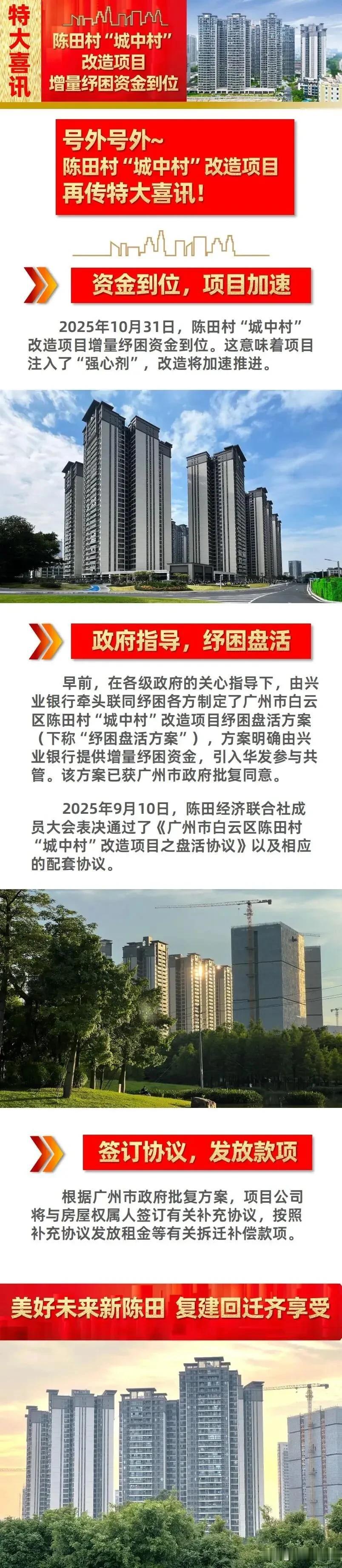 拒绝烂尾!白云区陈田村旧改引入华发,改造得以继续推进,二期复建房有望近期开工。 补签协议后,村民的租金和补偿款也会陆续到账。