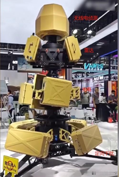 【软杀伤无人机防御系统】 图片为最新展出的URS-680一体化集成无人机防御系统,它属于软杀伤低空防御系统,采用多层旋转架构,可探测5千米内的无人机,在4千米内进行定向电子干扰。 该系统大体上分为四层结构,最上层为无线电侦察系统,中间二层为旋转雷达探测和光电跟踪系统,最下层为四个定向干扰杀伤系统。 接通电源后可24小时监控、连续运行一周,适用于关键基础设施和战略要地防御。