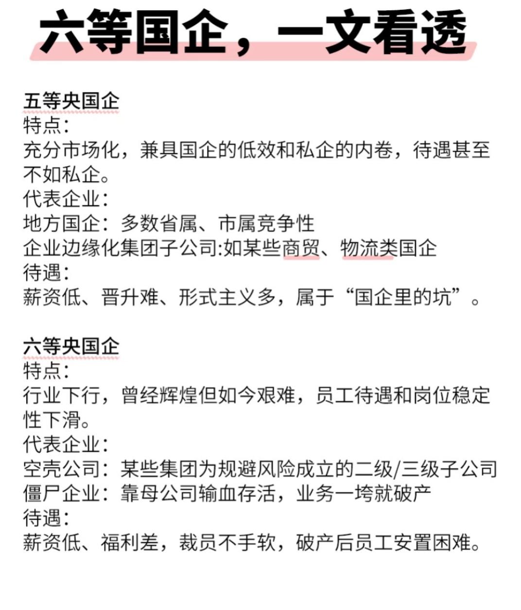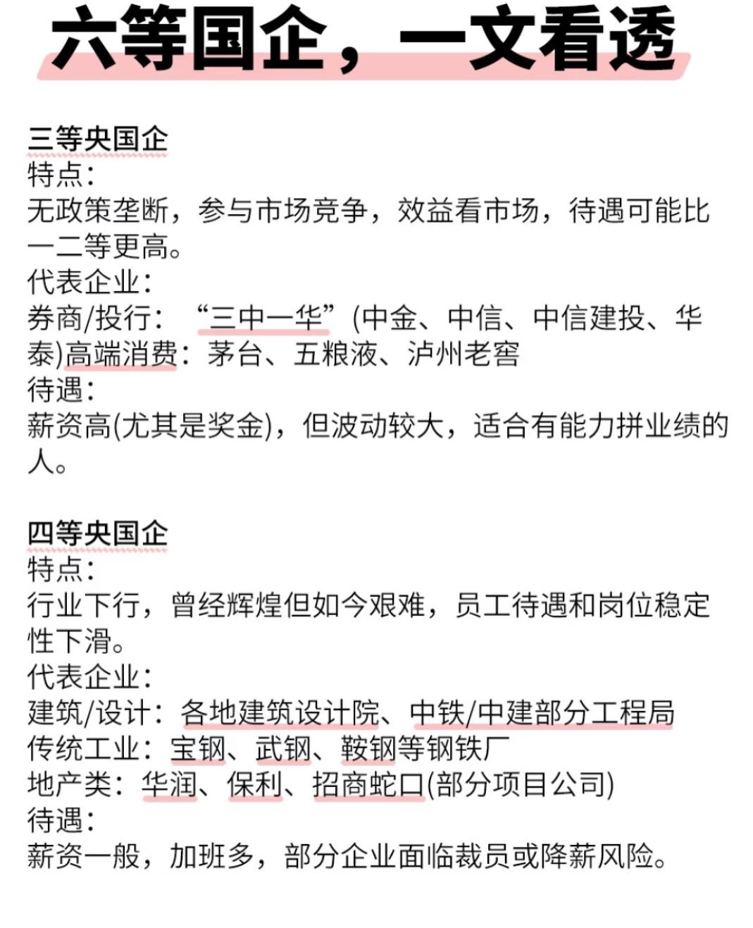 国企分这六等:有的是金饭碗,有的是“坑” 找工作时,“国企”两个字总带着“稳定”的滤镜,但其实国企内部的差距,比想象中要大——从一等的“金饭碗天花板”到六等的“踩坑预警”,每一档的体验完全是两个世界。 一等央国企是“金饭碗中的金饭碗”,特点是垄断市场、稳赚不赔。像烟草、国家电网、三桶油,每年上缴的利润是天文数字,员工的薪资高、福利全,只要不犯大错几乎不会被裁员。还有国开行、农发行这些政策性银行,工作节奏慢、待遇优渥,连年终奖都是按“稳”字来发,是很多人眼里“干到退休都不愁”的去处。 二等央国企是“稳中有优”,大多是寡头垄断或主业垄断的领域。六大国有银行、三大运营商属于这一档,薪资中等偏上,稳定性强,只是部分岗位有业绩考核——比如银行的柜员要拉存款,运营商的市场岗要推业务,但即便完不成指标,也很少会被辞退。稀土集团、航天科技这类战略资源、军工类国企,更是“旱涝保收”,只是岗位门槛相对高一些。 三等央国企是“高薪但看能力”,没有政策垄断,靠市场竞争吃饭,但效益好的时候待遇能超过前两档。比如“三中一华”这些券商投行,行情好的时候年终奖能拿半年工资,只是压力也成正比,熬夜做项目是常态;茅台、五粮液这类高端消费国企,利润高、福利好,连员工内购酒都是福利之一,只是岗位竞争激烈,不是谁都能挤进去。 四等央国企是“曾经辉煌,如今难”,行业在走下坡路。建筑设计院、中铁中建的部分工程局,早年是“香饽饽”,现在项目少了,加班多、薪资一般,部分工程局还面临裁员或降薪;宝钢、武钢这些传统工业国企,受行业周期影响大,福利不如从前,岗位稳定性也在下滑;华润、保利的部分地产项目公司,更是跟着地产行业的波动,缩编、降薪成了常态。 五等央国企是“国企缺点集大成者”,充分市场化却没学到私企的效率,反而兼具国企的低效和私企的内卷。多数省属、市属的商贸、物流类国企,薪资可能还不如当地的私企,晋升靠资历、形式主义多,比如开会要写十几页的汇报材料,实际干活的时间没多少,被称为“国企里的坑”一点不夸张。 六等央国企是“踩坑预警”,要么是行业下行到难以为继,要么是靠母公司输血的“空壳”。有些集团为了规避风险成立的二级、三级子公司,本身没有实际业务,全靠母公司拨款存活;还有些“僵尸企业”,业务早就停了,员工薪资低、福利差,一旦母公司停止输血,破产后连安置都成问题,裁员更是毫不手软。 其实国企的“好”与“坏”,本质是行业和资源的差异——垄断性强、和国家战略绑定的领域,自然能给员工兜底;而充分竞争、行业下行的领域,国企的“稳定滤镜”也会失效。 在你看来,找工作时,是该盯着国企的“稳定”标签盲目选择,还是先看清它属于哪一档,再结合行业前景做决定?国企 央国企求职条件 国企待遇 央国企 央企职场真相 公司国企 央国企机会