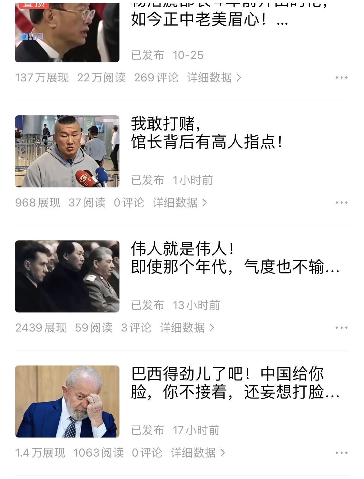 友友们弱弱地问一句: 大家这两天的数据正常吗? 上千展现量,有点赞量、有评论,半个小时了阅读量还是0,这明显感觉不合理啊! 大家有没有发现,这次改版后怪怪的,写着那么糟心呢!这两天阅读量基本没上过4位数的,几十、几百的…… 到底是个啥情况?有清楚的朋友吗?给解答一下~
