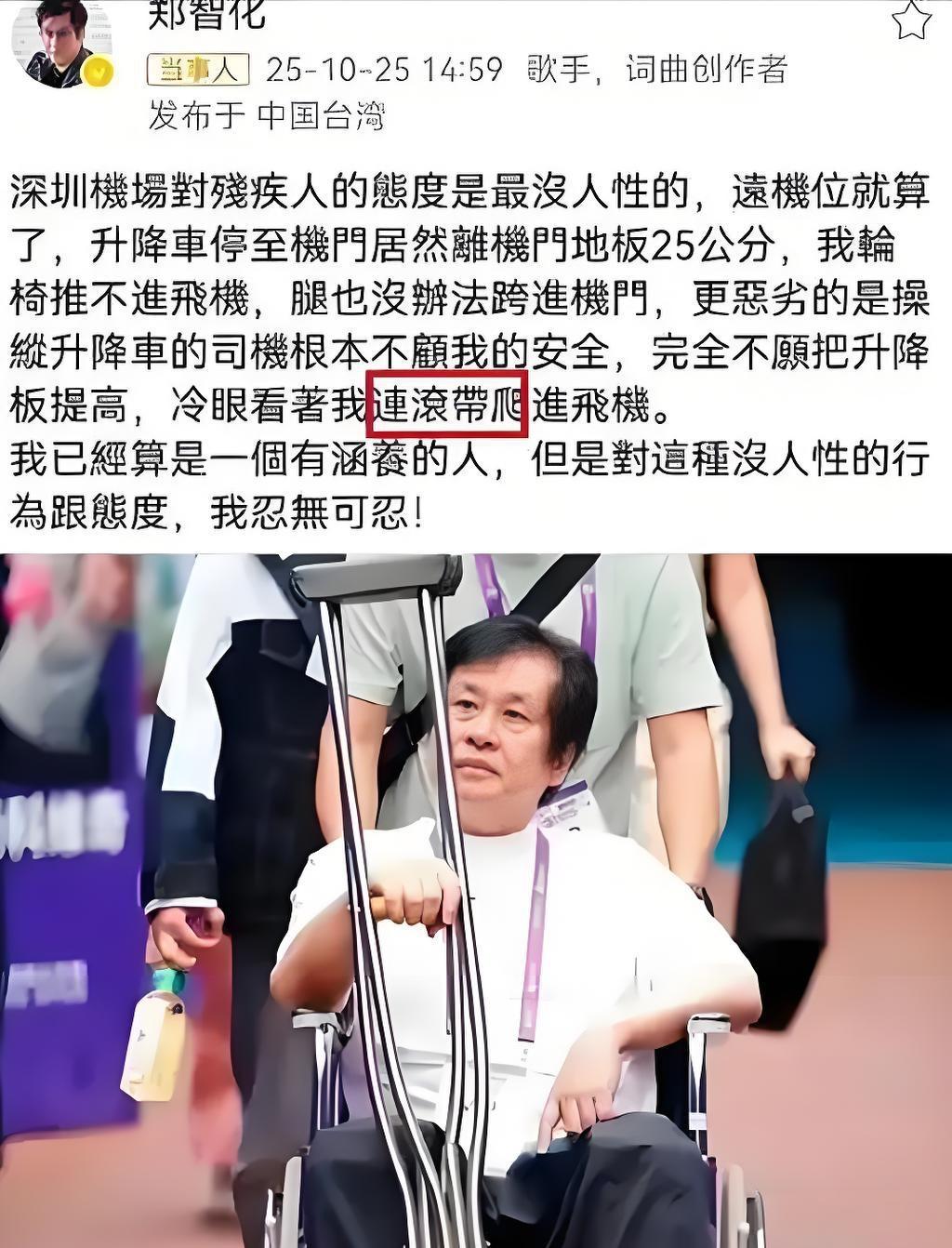 《水手》的歌声 还在耳边, 人却被网暴逼退网了! 郑智化清空所有微博,兑现了之前“关掉账号”的话,这结局也太让人意难平了。 谁的青春里没听过《水手》啊?可唱着“擦干泪不要怕”的人,终究还是被网暴逼退了网。 63岁的郑智化因小儿麻痹症腿脚不便,前段时间吐槽深圳机场登机时要“连滚带爬”,本意是说残障人士出行难 。虽然后来道歉说用词过激,也感谢了帮忙的工作人员 ,但监控流出后,骂声全来了,说他卖惨、博同情,甚至有三万赞的恶意评论。 他说“微博成了别人的公共厕所”,直言要关掉账号,如今真的清空了所有内容,连道歉帖都没留 。那个曾给无数人力量的歌手,最后以这样的方式离场,实在让人心里不是滋味。