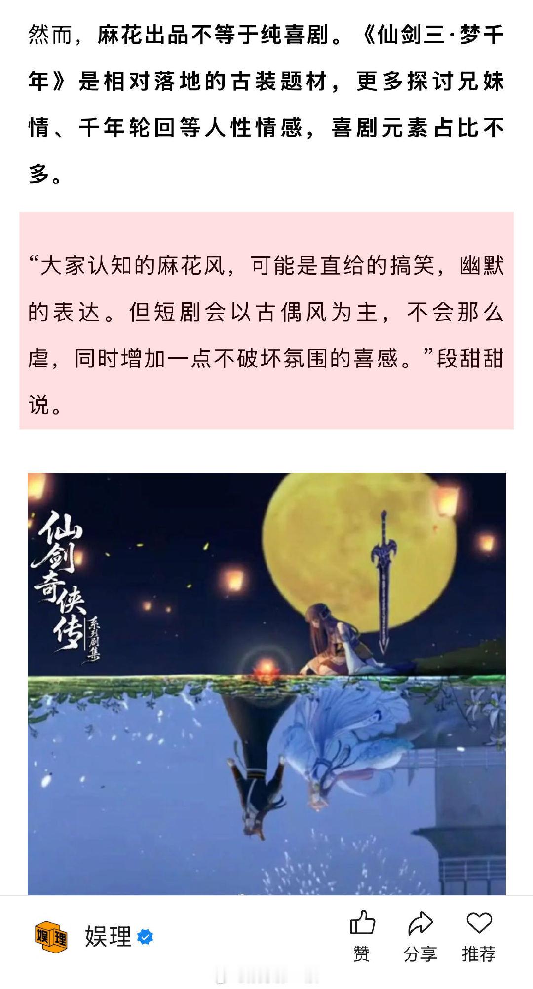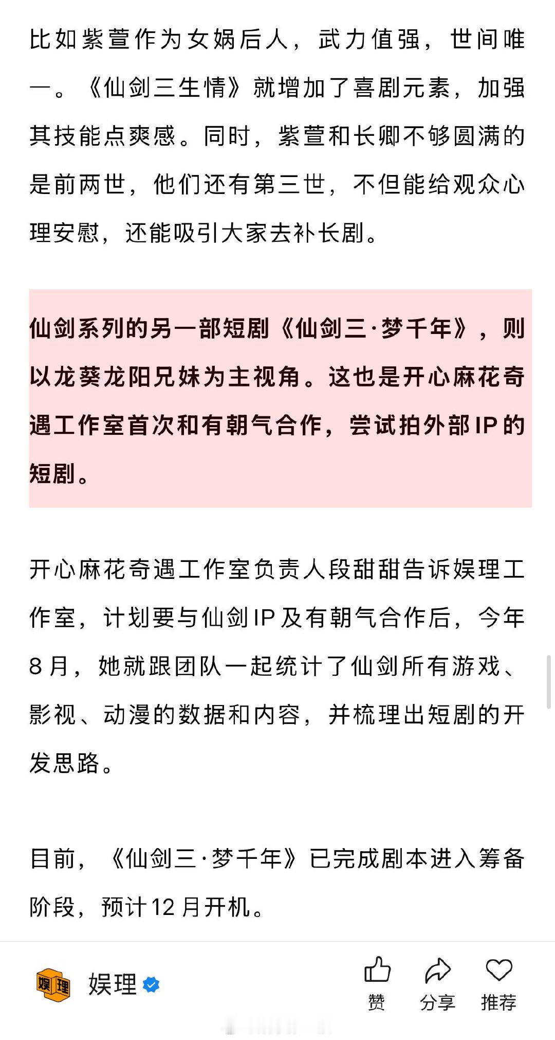 短剧仙剑将拍龙葵龙阳番外 制片人谈仙剑短剧主角是紫萱徐长卿 短剧《仙剑三·梦千年》以龙葵龙阳兄妹为主视角,目前已完成剧本进入筹备阶段,预计12月开机。制作方开心麻花奇遇工作室和负责人段甜甜表示,“大家认知的麻花风,可能是直给的搞笑,幽默的表达。但短剧会以古偶风为主,不会那么虐,同时增加一点不破坏氛围的喜感。”娱理独家↓