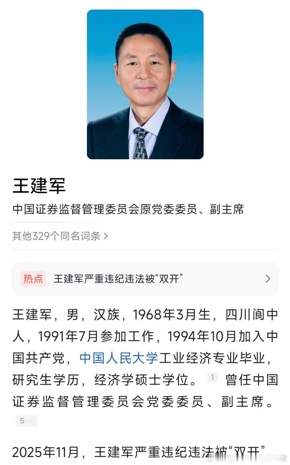 王建军被双开中国证监会原党委委员、副主席王建军严重违纪违法被开除党籍和公职!热点