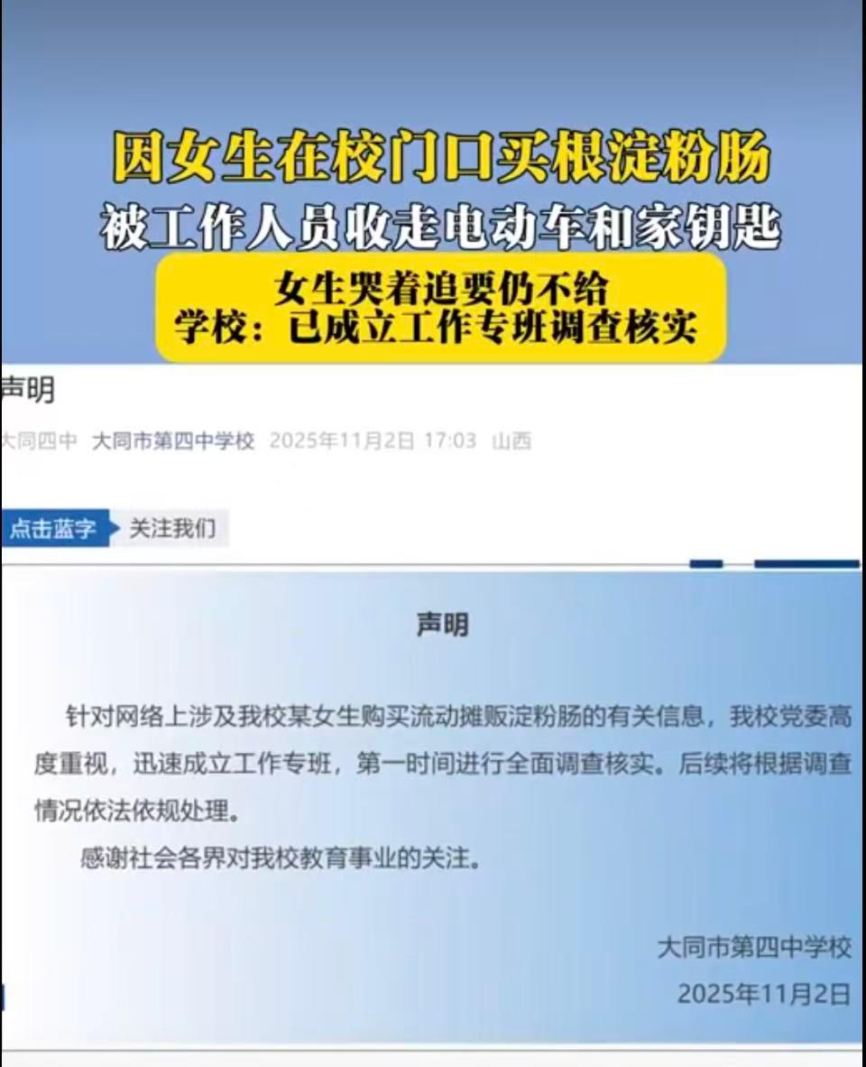 女生买根淀粉肠,竟引起校党委高度重视,要依法处理。 事因是女生在校门口买淀粉肠,被工作人员夺走电动车钥匙和家钥匙,还高声呵斥“看我不给你。” 先不说别的,放学时间、校外场所,学生买根小吃到底违反了哪条法律法规?就算担心流动摊贩的食品安全,好好沟通引导不行吗?凭什么直接扣押学生的私人财物?尤其是家门钥匙,这关系到学生的居家安全,工作人员哪来的这么大权力? 更让人迷惑的是学校的声明,通篇都在说“校内某女生购买淀粉肠的有关信息"。校党委高度重视,迅速成立工作专班,全面调查核实,依法处理。而对女生被夺钥匙、呵斥学生的核心争议只字不提。不知情的人怕是要以为,这女生买淀粉肠犯了多大的罪,需要校党委如此兴师动众。 其实重视校园食品安全是好事,但管理不能失了分寸和温度。教育的初衷是保护学生,而不是用粗暴的方式压制学生。工作人员的行为已经超出了管理的边界,涉嫌侵犯学生的合法权益,学校不反思自身管理问题,反而避重就轻,实在让人难以接受。 一根淀粉肠而已,怎么就上升到这个高度了?你们觉得学校这么做合理吗?