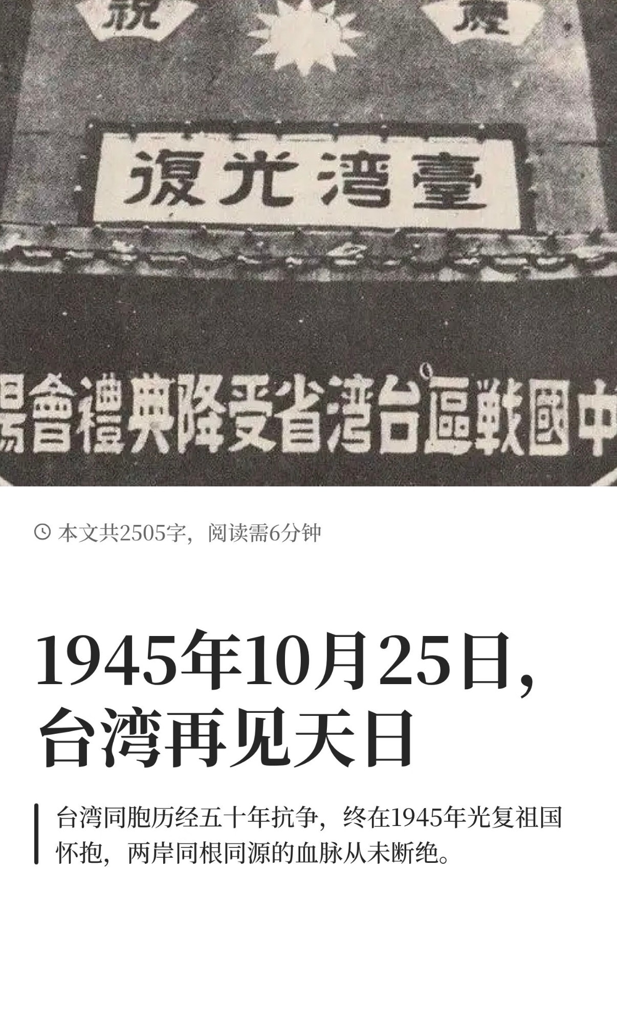 台湾不能再吃战争的苦1945年台湾光复,历经50年日本殖民统治后重归中国版图。台湾同胞通过抗日斗争、文化反抗和跨海追光,最终在1945年8月15日日本投降时迎来解放。光复后,台湾迅速恢复中华文化地位,两岸同胞共同铭记这一历史时刻
