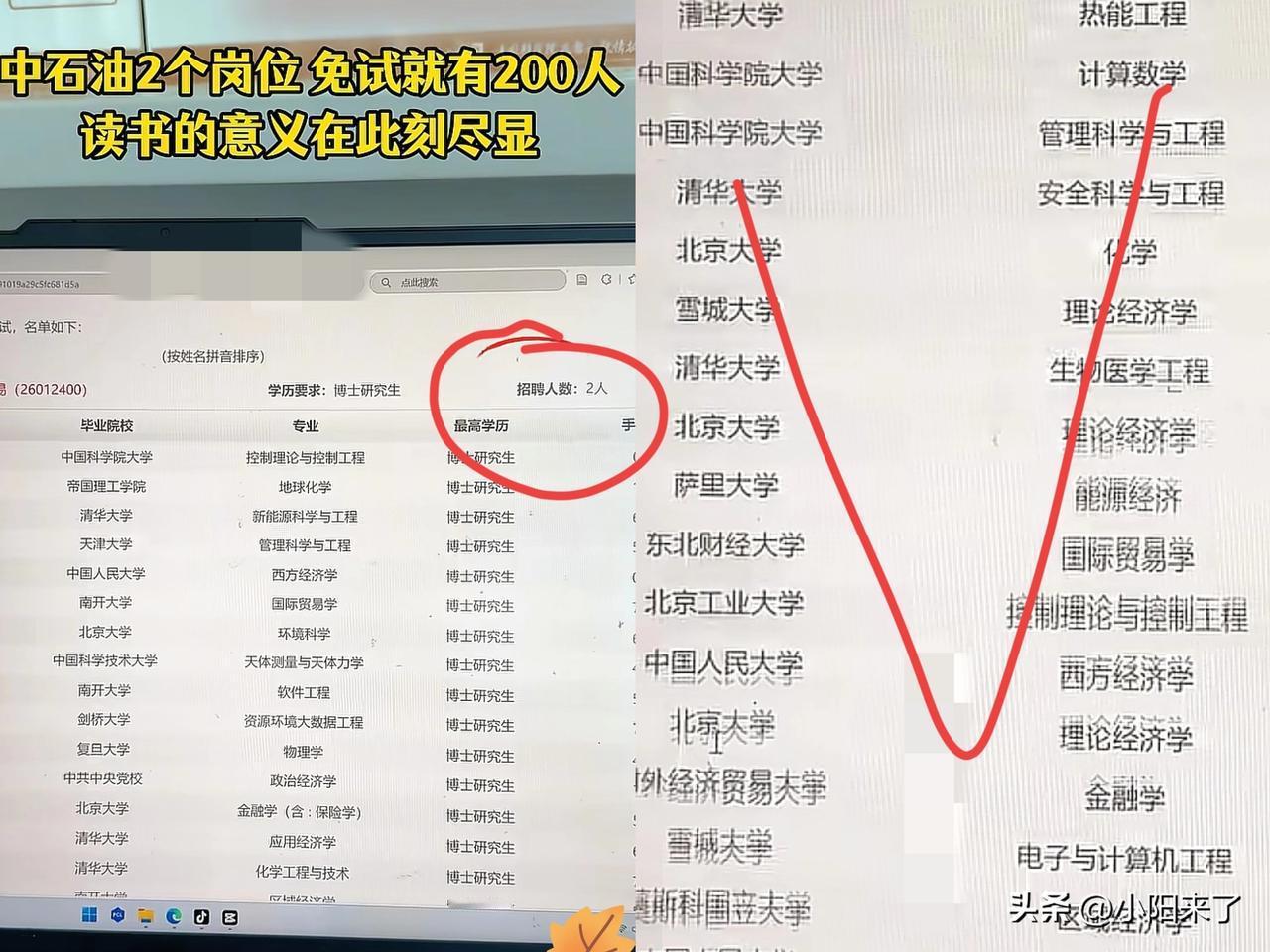 中石油招聘2人,学历要求博士研究生,结果来了200多个面试的,全是985名校,毕业于清华、北大、剑桥等 不少人怒喷“教育资源白瞎了”,可没人深究:这群站在学历金字塔尖的人,真的会做亏本买卖吗? 如今每年硕博毕业生超百万,对口研发岗要么门槛高到离谱,要么薪资撑不起多年深造成本! 反观央企行政岗,稳定编制、落户福利、隐形保障样样扎实。对他们而言,这不是“屈才”,而是算透了生活的账! 与其在私企996拼到35岁面临失业焦虑,不如选一份能稳稳看到未来的工作! 更何况,国企里高学历本就是晋升的隐形优势,这步棋其实精明得很! 所谓的“浪费”,不过是我们用旧眼光衡量新选择! 你觉得高材生选安稳是妥协,还是对现实最聪明的回应?来评论区聊聊你的看法!