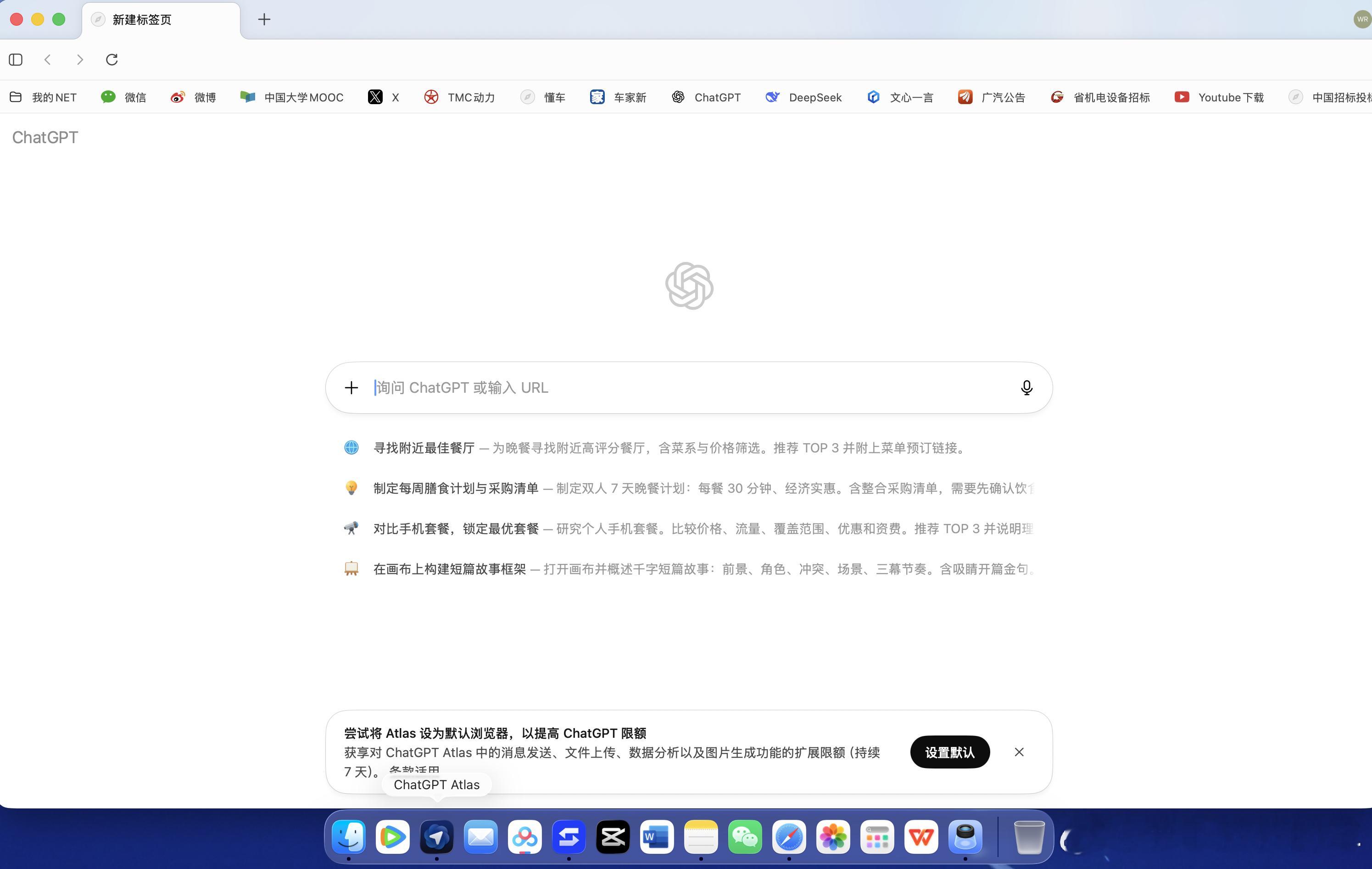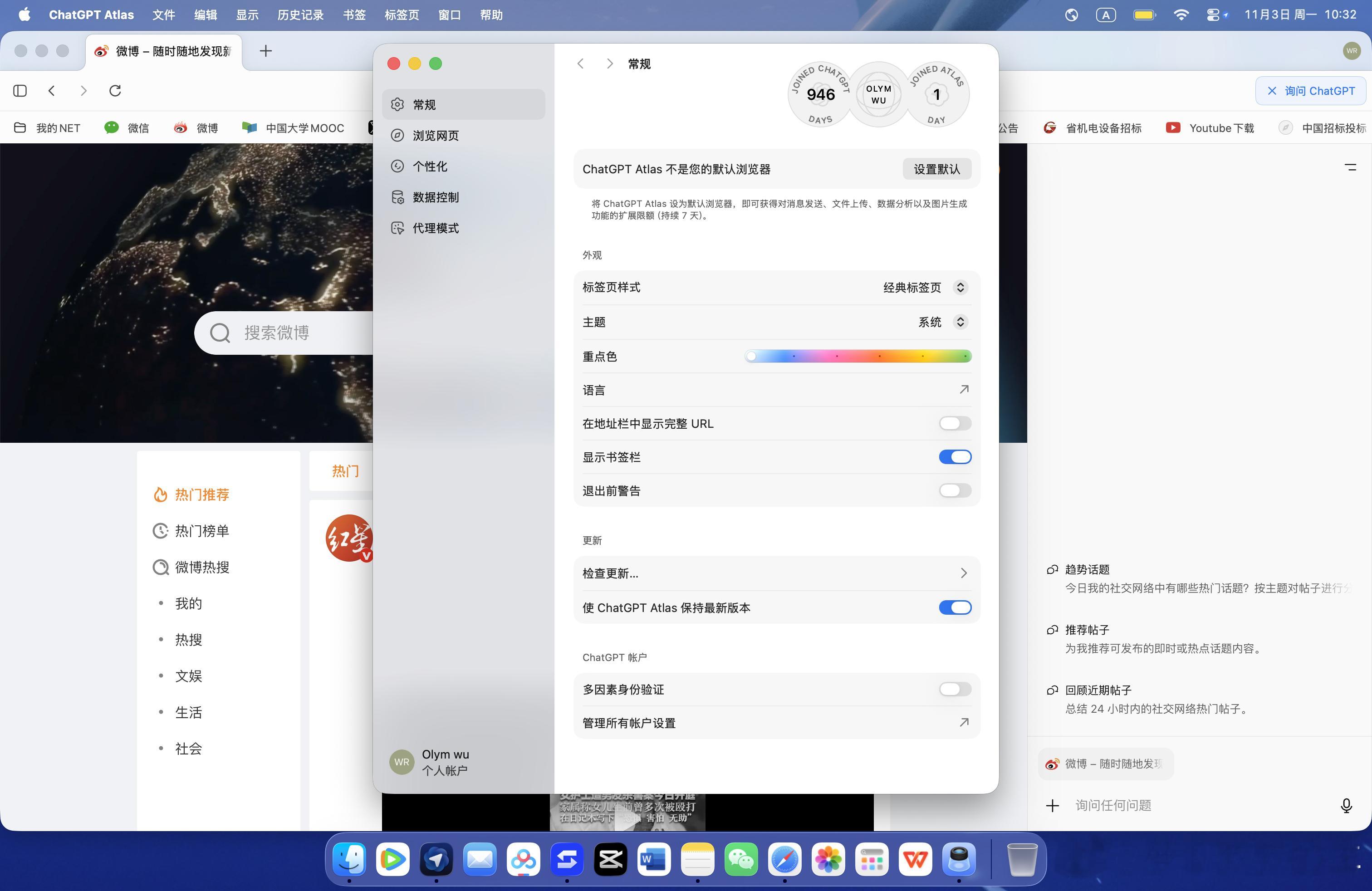 用上了ChatGPT Atlas浏览器,我还以为国内无法安装,整体设计跟谷歌浏览器类似,在首页嵌入了ChatGPT,初体验还不错,整个设计风格比较简约清新,是我会喜欢的风格。