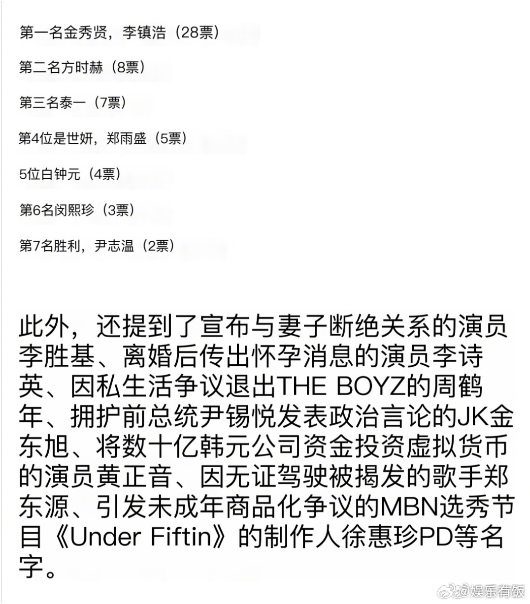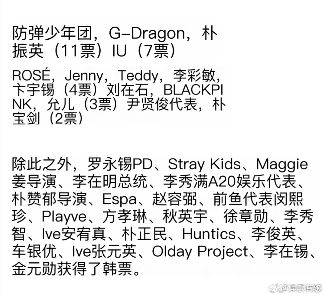 韩国 110 位娱乐业界人士参与的年末调查榜单今日揭晓。年度娱乐人物榜单中,防弹少年团、权志龙、朴振英、IU、朴彩英、Jennie、李彩玟、边佑锡、刘在石等一众艺人入选;而年度最差人物则有方时赫、文泰一、郑雨盛、白钟元、闵熙珍、李胜利、李昇基、李诗英、周鹤年、黄正音等人。