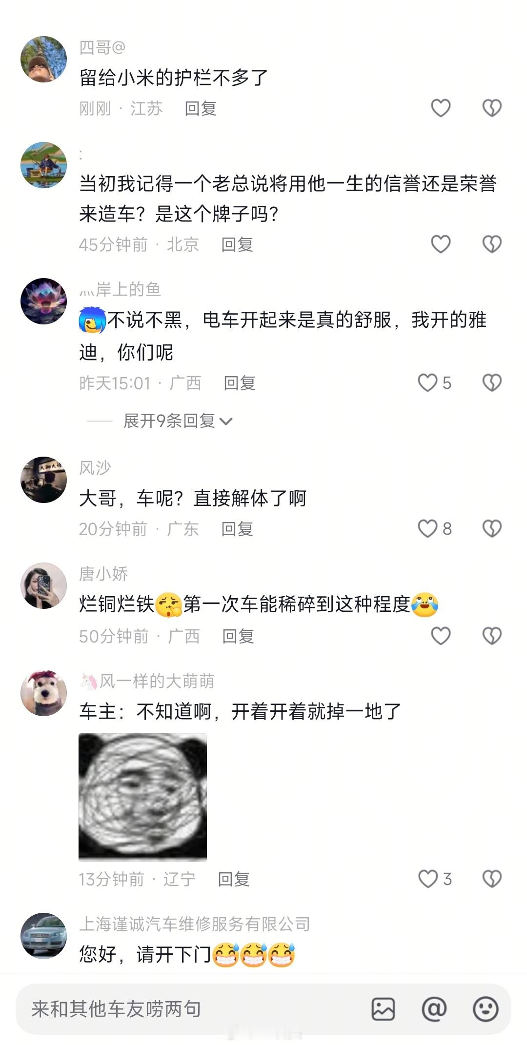 拍个事故现场,不拍车,然后一传十十传百,小米车解体了,谣言就这么来了。[微笑]