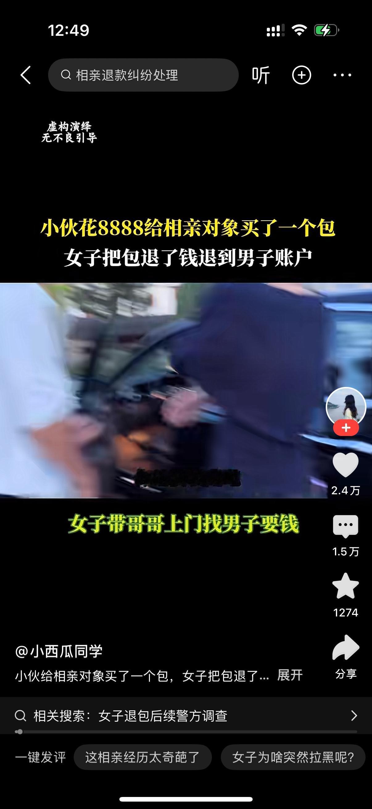男子给女人买了一个8888块钱的包包。女的不喜欢,去退包,钱原路返回到男子的账户。女人直接过来找男子要钱。男人说,你疯了吧?这钱是我的哎。女人说,这包是你买给我的,所以是我的。钱就是我的。男子说,我给你买完包之后,到了晚上你发短信给我说你没有看上我呀。所以这个钱我不能在花在一个不值得的女人身上。女人却不罢休,拉住男人不让走。男人急了,甩手就是一巴掌,见过不要脸的,没见过你这样的。