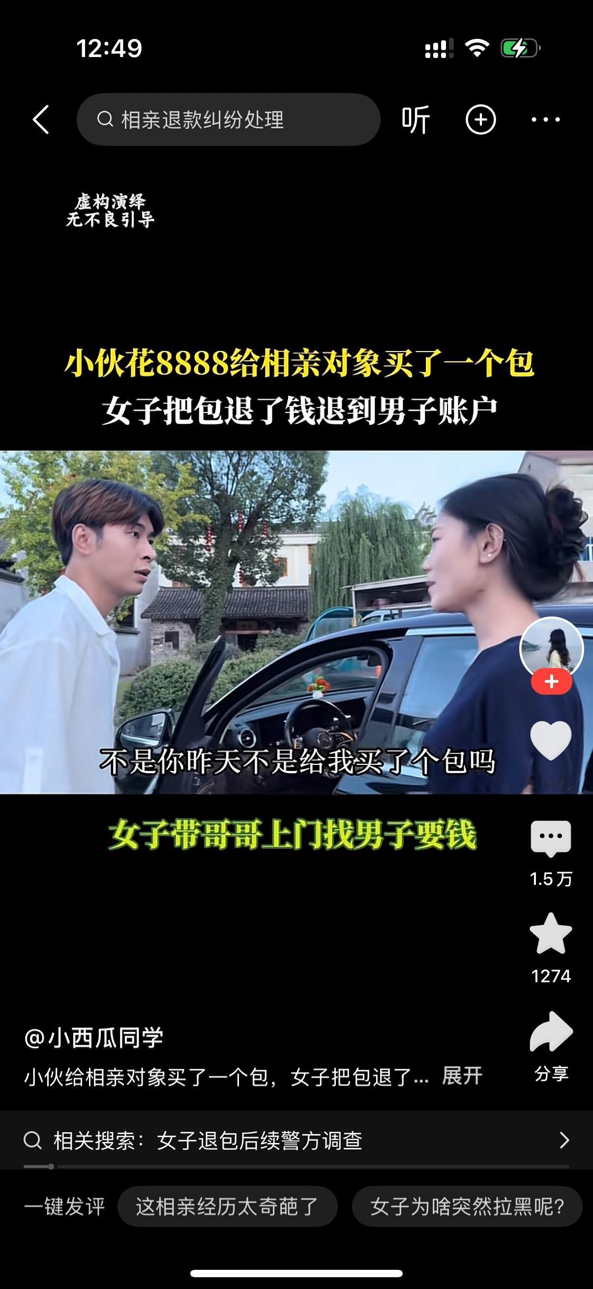 男子给女人买了一个8888块钱的包包。女的不喜欢,去退包,钱原路返回到男子的账户