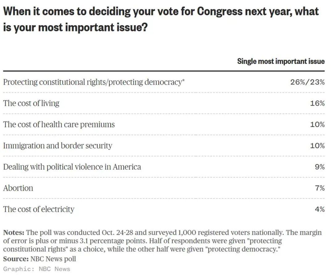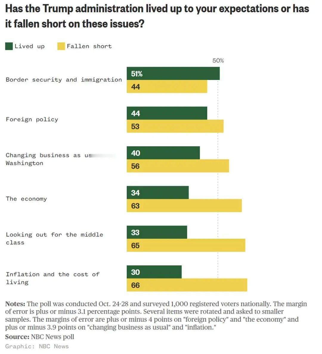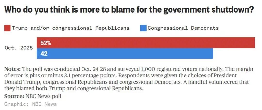 最新的全国广播公司(NBC)民调给民主党带来了一线希望。据NBC的最新全美民调显示,在联邦政府持续停摆的背景下,民主党在明年中期选举的竞争中以50%:42%暂时领先共和党8个百分点——这是自2018年中期选举以来,NBC民调中任一政党在国会选票上取得的最大领先幅度。 特朗普的支持率为43%,不支持率为55%。越来越多的选民表示,特朗普在曾助力他重返白宫的多项关键议题上未能达到他们的期望。约三分之二的登记选民认为,特朗普政府在经济和生活成本方面表现不佳;多数人还认为,他未能改变华盛顿一贯的政治运行方式。 民主党在努力提出替代方案时,仍然面临选民评价低迷的问题。此外,随着特朗普继续在移民及其他关键政策领域推动广泛的行政行动,选民认为“捍卫民主与宪法权利”与“生活成本问题”同样是最重要的议题。而多数选民认为,特朗普所做的更多是削弱宪法,而非捍卫宪法。 多数选民认为,本轮政府停摆在更大程度上应怪罪于特朗普和/或国会共和党人。 图片来源于网络