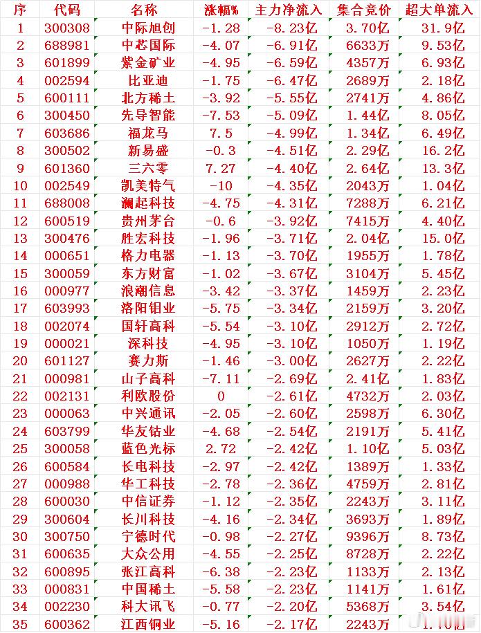 11月3日开盘45分钟,主力资金“卖出的”35名单!中际旭创:净流出8.23