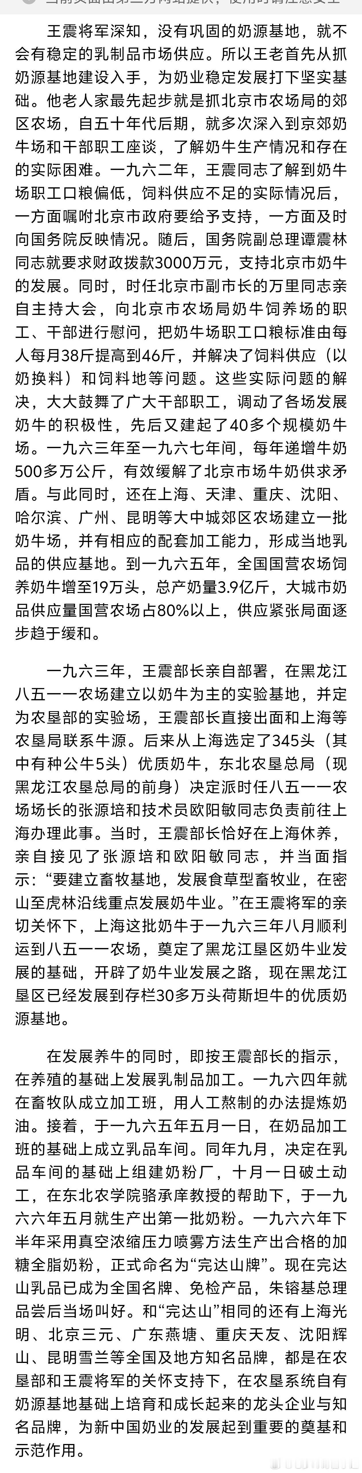 直接上农业部官网数据,1949年,我国仅有奶牛12万头,产奶量21万吨。大城市居民牛奶供应十分紧张。毛主席和周总理担忧老百姓喝不上牛奶,不够营养,多次发批示给农垦部部长王震将军,抓好娃娃喝奶问题。王震将军找来专家多次开会,探究培育奶牛提高产奶量的方法。1963年-1967年,在北京上海昆明等地的郊区建立国营牛奶场,这些国营牛奶场后来经过市场经济改革,演变成我们耳熟能详的光明、燕塘、风行。