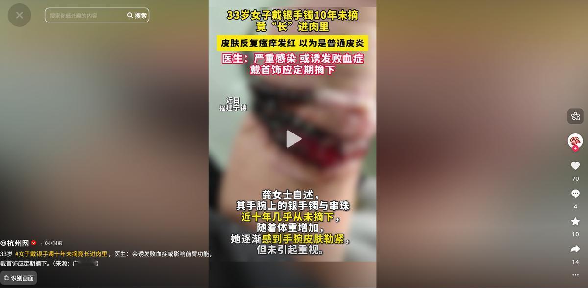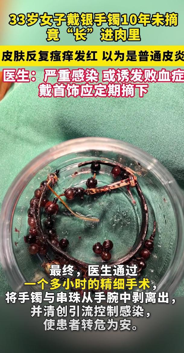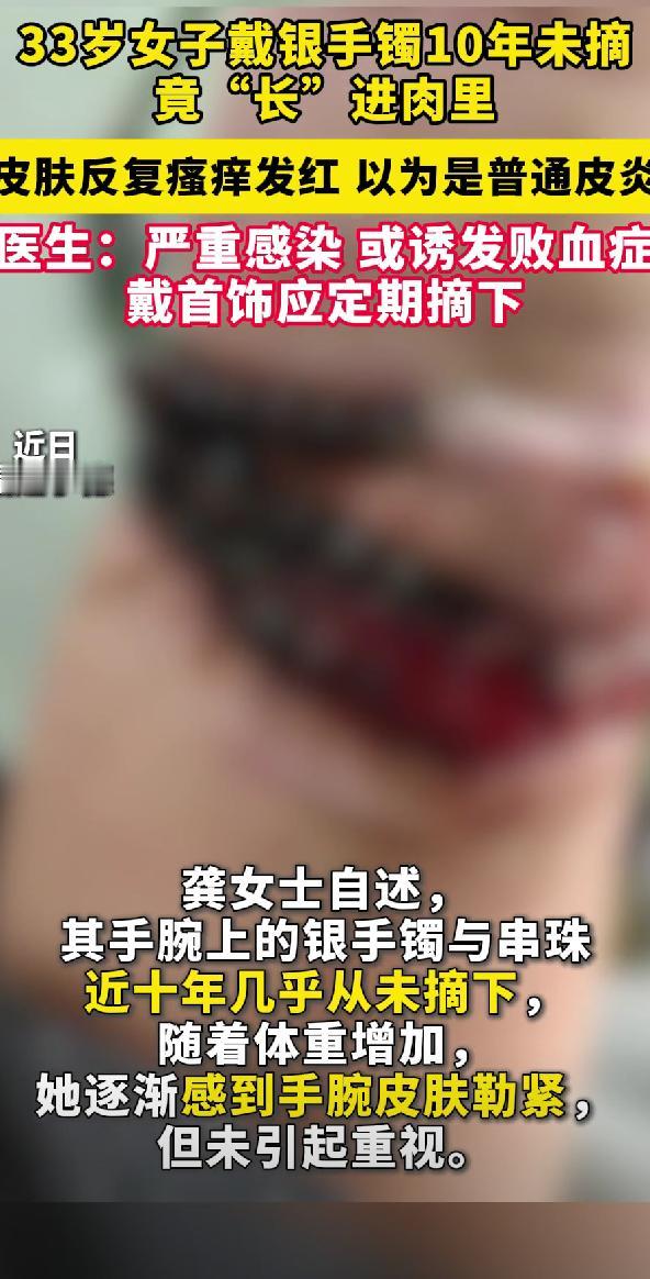 福建宁德,女子发现手腕的位置反复疼痛发痒,开始还以为是皮肤发炎,可随着疼痛加剧,去医院检查才知道,是戴了手镯十年没摘嵌进肉里,医生告知:再晚点来就要影响前臂功能了! 福建宁德的龚女士,手腕上戴着枚银手镯,还串着一串珠子,这两样东西一戴就是快十年,平时洗澡、干活都没摘过。在她眼里,这不仅是个饰品,戴久了也成了习惯,甚至有点念想在里面,从没想过有一天会因为这玩意儿要去医院动刀子。 大概半年前龚女士开始觉得手腕不得劲,戴手镯的地方总有点发红,偶尔还发痒,她也没太当回事,琢磨着可能是天热出汗多,闷得皮肤发炎了,或者是不小心碰到什么东西过敏了。 家里正好有之前剩下的药膏,她就每天睡前涂一点,涂完感觉痒劲能缓解点,便更没放在心上,想着 “小毛病,慢慢就好了”。 可这 “小毛病” 没好反而越来越糟,大概两周前龚女士的手腕突然疼得厉害,之前只是痒现在一碰到就钻心疼,而且红肿得越来越明显,仔细一看手镯边缘的地方竟然还开始流脓。 她这才慌了神,想把手镯取下来看看里面到底怎么了,可一拽就疼得钻心,再仔细瞧才发现手镯和珠子已经紧紧贴在皮肤上,有一部分甚至嵌进了肉里,根本没法自己取下来。 家人看着她疼得直皱眉,赶紧催她去医院,到了医院,医生一检查脸色就严肃起来:“这哪是普通发炎啊,手镯戴太久没摘,一直压迫着皮肤,汗液和污垢都积在缝隙里,早就滋生细菌了,现在已经严重感染,再晚点来感染顺着手臂扩散,连前臂的功能都可能受影响。” 龚女士听了这话后背都冒冷汗,她怎么也想不到戴了十年的手镯,竟然会变成这样的 “麻烦”,医生说,她的手腕因为长期被固定尺寸的手镯勒着,这些年手腕慢慢有了变化,之前宽松的手镯不知不觉就成了 “紧箍咒”,一直摩擦皮肤,加上清洁不到位,才会从轻微不适发展到感染化脓,现在必须做手术,才能把嵌进肉里的手镯取出来,再清理感染的伤口。 后来做手术的时候,龚女士还在想,当初为啥就没想过摘下来呢?其实也不是没察觉过手镯变紧,只是戴了太多年,总觉得 “摘下来可能就戴不回去了”,而且心里隐隐有点迷信,觉得一直戴着的东西摘了不吉利。 更多时候是习惯了,觉得 “反正也不影响啥,懒得折腾”,就算偶尔有点勒得慌,也总想着 “忍忍就过去了”,没成想最后竟拖到要动刀的地步。 这事儿后来被人提起来,不少人都有共鸣,生活里谁没这样过呢?牙齿有点隐隐作痛,想着 “再忍两天,说不定就好了”,结果拖到疼得睡不着才去看牙医,肩膀酸了、腰不舒服了,也总觉得 “是累着了,歇两天就没事”,没想着及时检查。 我们总爱对这些 “小不舒服” 视而不见,觉得 “没那么严重”,可身体的警报从来不会因为我们的忽视就停止,反而会慢慢升级,小问题拖成大麻烦。 龚女士手术后,手腕的疼痛慢慢缓解了,只是留下了一道小疤痕,现在她再看那些贴身的饰品,再也不敢 “一戴到底” 了,会定期摘下来清洁,也会留意身体有没有不舒服的信号。 她总跟身边人说:“以前觉得戴久的东西有感情舍不得摘,现在才明白,再贵重的念想,也比不上自己的健康重要,身体发出来的那些小信号,可千万不能不当回事啊。” (信息来源:杭州网)