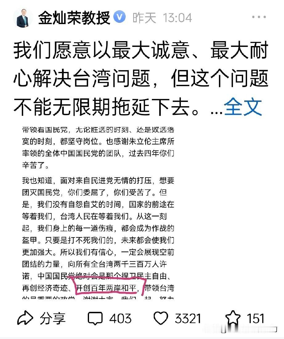 金灿荣教授两天发了同样的一张图,让人警醒。 第一天只说了一句话:郑丽文的“开创百年两岸和平”,是什么意思? 获得了2500多赞和2300多评论。 第二天说了一段话,看起来是对前天那一句话的解释。获得了3300多赞和400多评论。 金教授为国担忧,一片赤诚之心。正如金教授所说,“我们愿意以最大诚意、最大耐心解决台湾问题,但这个问题不能无限期拖延下去”。难道我们会允许它再停一百年才能解决吗?我们已经说过了,这代人的问题不能再留给下一代来解决,金教授也说过,我们这代人都能看到祖国统一。 台湾当归!这是14亿中国人的心愿。中华民族伟大复兴就包括台湾回归的大事,所以说统一的脚步已经近了,幻想“百年两岸”的错误思想是行不通的。