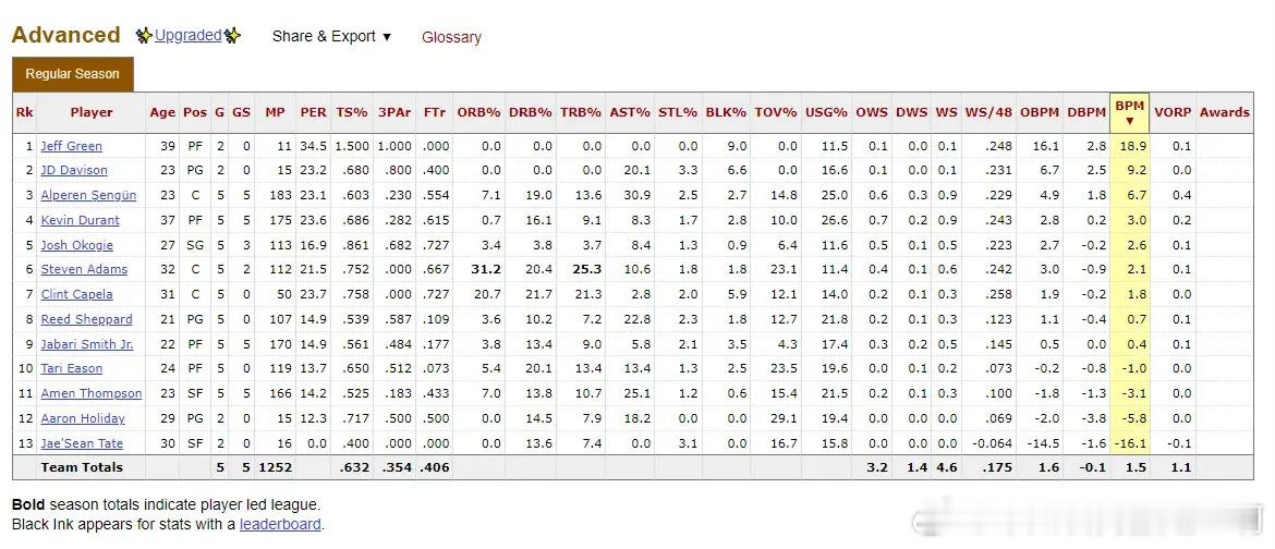 前五场打完,火箭队球员高阶数据一览,门神得加油了,各项基础和进阶数据,尤其是之前的强项BPM严重走低,