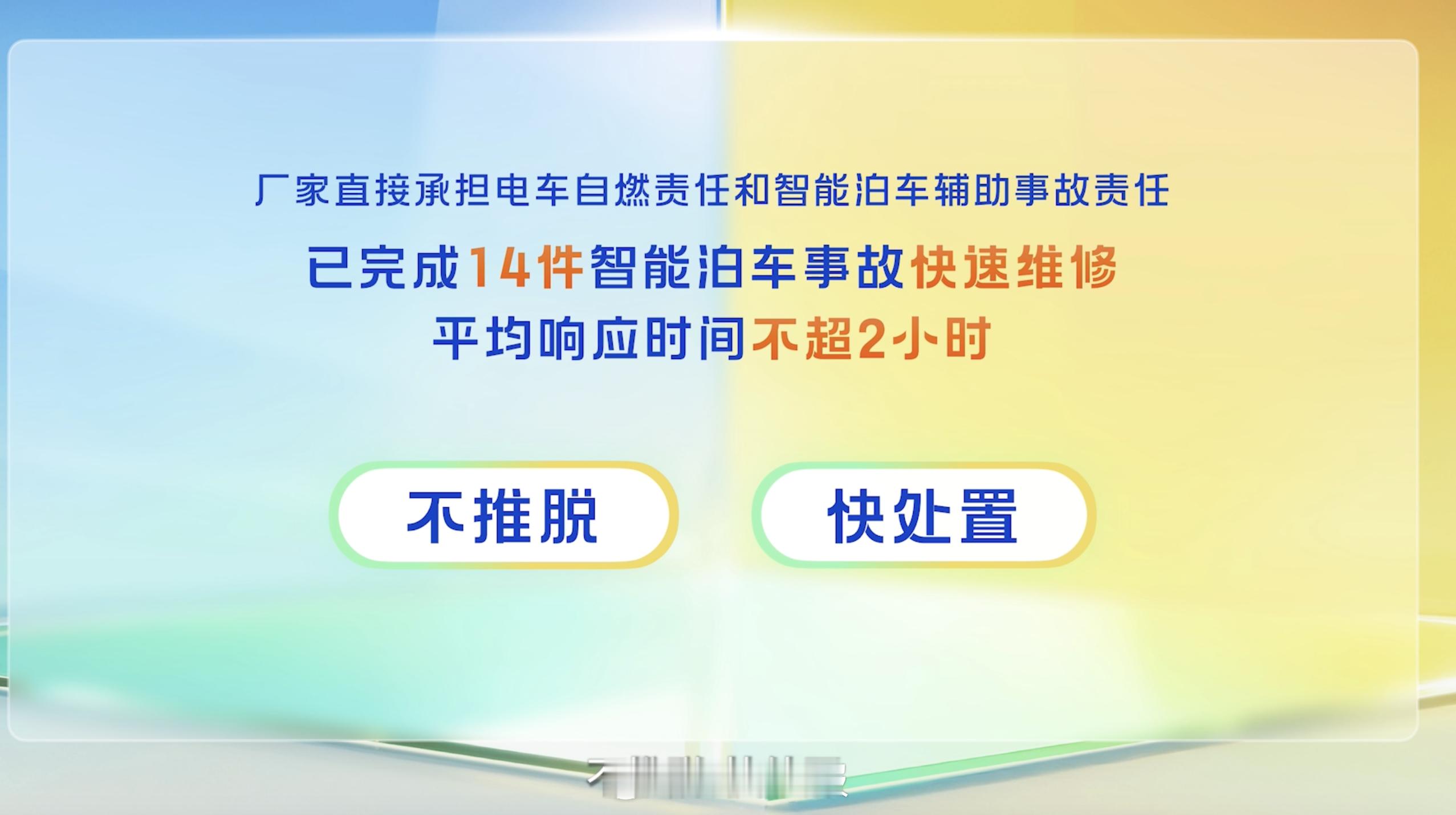 在原有的“电车自燃与智能泊车辅助事故厂家担责” 政策,再新增两条。1、冬季续航守护行动:有电池疑问免费检查,有电池问题直接更快。2、承诺电池衰减厂家担责:直接换原厂电池,不要钱。
