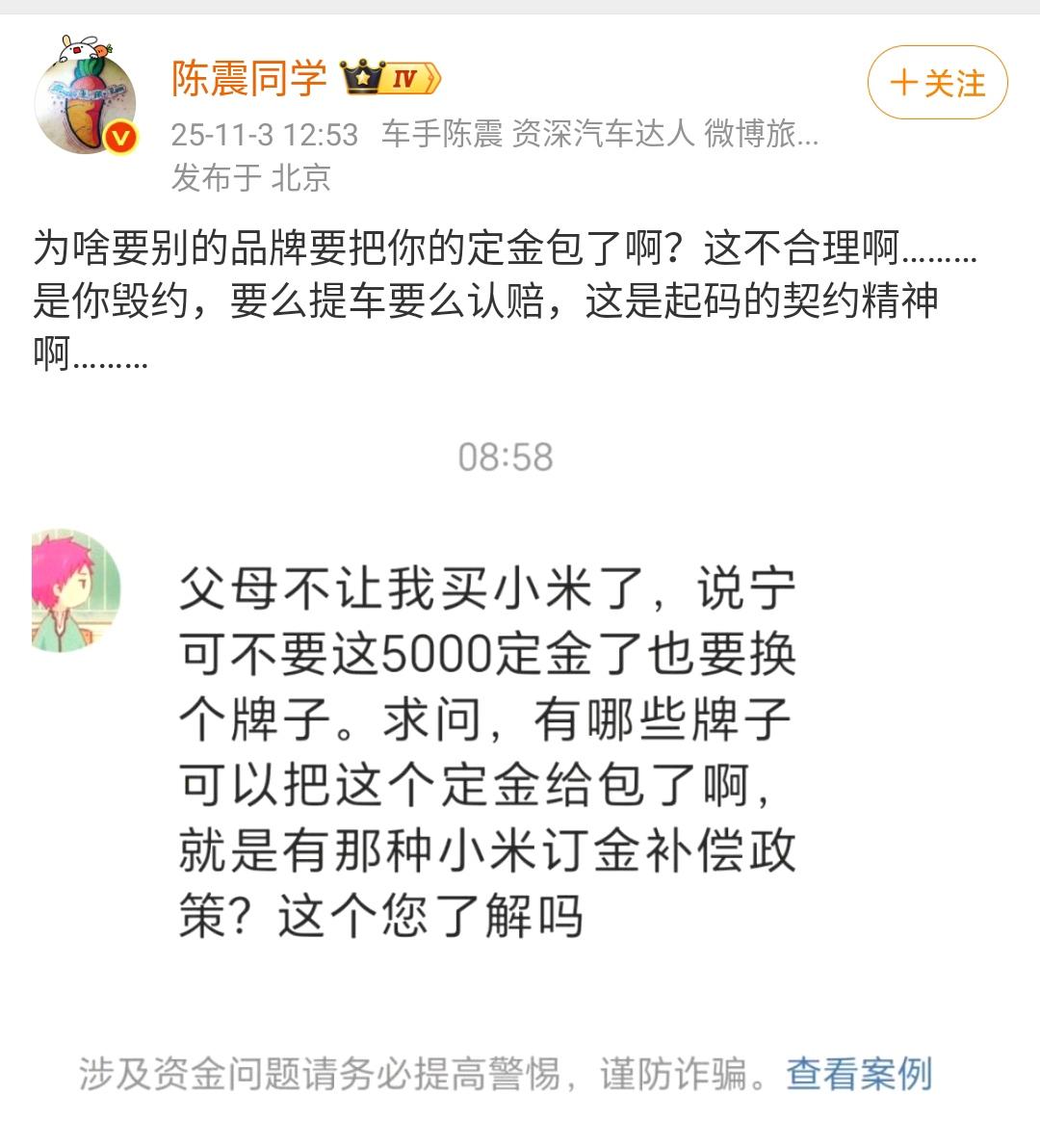陈震:为啥要别的品牌要把你的定金包了啊?这不合理啊………是你毁约,要么提车要么认赔,这是起码的契约精神啊……… 确实有牌子推出了这种服务,你购买小米汽车,然后你跑到他那里订车,这5000块钱就给你包了。 相当于花了5000块钱揽了一个用户,对于企业来说是划算的,因为这个5000块钱是你提车之后企业才会给你报销。 各位是怎么看的?欢迎评论区留言。