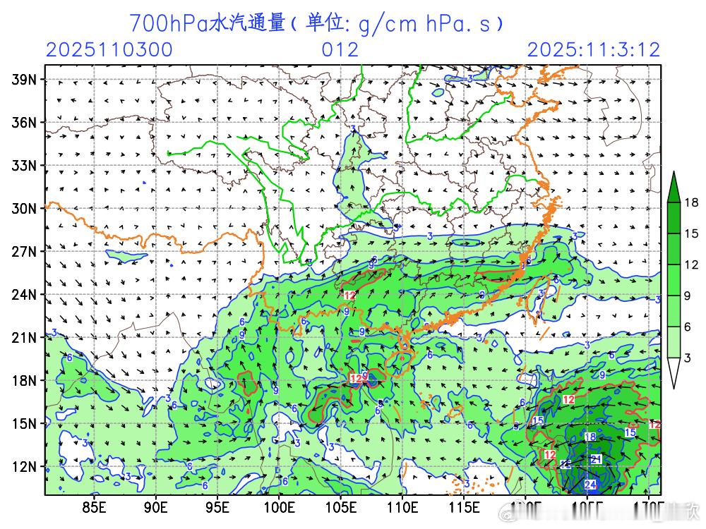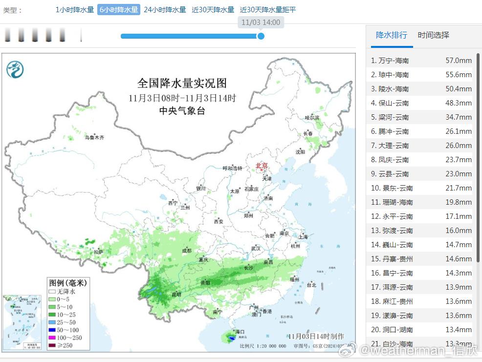 【降水】今天08-14时,南方出现大范围降水,海南和云南站点包揽6小时降水榜前10,海南万宁、琼中、陵水雨量超50毫米,排名前3。海南的降水为南海上偏东风水汽输送导致。云南的降水主要是低空南风-西南风把孟加拉湾水汽输送上来导致。两支水汽合力,也使得贵州湖南江西等地出现降雨。