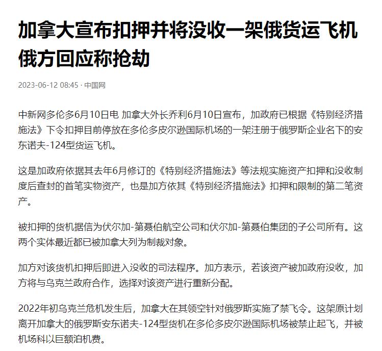 “盗窃”,加拿大扣押俄罗斯的飞机转送乌克兰,这是实打实的盗窃行径,俄罗斯向加拿大索赔1亿美元。 这事得从那架倒霉的安-124大飞机讲起。它是俄罗斯伏尔加-第聂伯航空公司的“空中巨无霸”,论装货能力在全世界都数得着,不管是军用品还是大型设备,都得靠它来运。 2022年初乌克兰那边开打后,加拿大马上就对俄罗斯关闭了领空,这架正准备飞离加拿大的安-124,直接被拦在了多伦多皮尔逊国际机场,连起飞的份都没有,机场还天天给它记着巨额的停机费。 一开始大伙儿都以为就是临时限制,没想到加拿大早憋着坏心眼。2023年6月,加拿大外长乔利直接放话,说依据他们改过后的《特别经济措施法》,要正式扣下这架飞机,紧接着就启动了没收流程。 更过分的是,加拿大方连遮遮掩掩都懒得做,明说要是没收成了,就和乌克兰商量着“重新分配”这架飞机,说白了,就是当个人情直接送出去。 这操作简直把“双标”和“强盗逻辑”刻在了脸上。要知道,这架飞机是俄罗斯私人公司的合法财产,既没参与打仗,也没违反加拿大的法律,就因为它是俄罗斯的,就要被硬抢。 俄罗斯驻加拿大使馆气得直骂,说这“纯粹就是拦路抢劫”,特鲁多政府管着的加拿大,根本没什么法治可言。俄罗斯大使斯捷潘诺夫更是警告了好几次,这种动别人东西的事,早晚要付出代价。 其实这也不是加拿大第一次干这种缺德事了。早在2022年底,他们就用同样的借口,扣了俄罗斯富豪阿布拉莫维奇公司的2600万美元资产,这次扣飞机,是他们靠这部法律弄到手的第一笔实物资产。 一套“用自己国家的法律管别的国家资产”的把戏玩得挺溜,但在国际法面前,这根本站不住脚,哪个国家都没权利随便动别的国家公民或公司的合法财产,这是大家都认的规矩。 俄罗斯可不会吃这个亏,好几次沟通都没结果后,俄罗斯直接把官司捅到了海牙国际仲裁委,一份索赔1亿美元的申请交了上去。这笔钱不只是飞机本身的钱,还包括这些年航空公司没法用飞机的损失、机场的停机费等等。俄罗斯的态度很明确:要么还飞机,要么赔钱,想耍无赖把东西吞了,门儿都没有。 现在这事闹得全世界都看加拿大的笑话。加拿大以为把飞机送给乌克兰能卖个人情,却忘了自己把本国的信誉招牌砸了。以后哪个国家还敢把飞机、资产放在加拿大?今天能以“特别经济措施”为借口扣俄罗斯的飞机,明天就能用别的由头动其他国家的资产,这种一点底线都没有的事儿,只会让加拿大在国际上越来越没人理。 说到底,国家之间打交道得讲规矩,不能拿“制裁”当抢劫的幌子。俄罗斯这1亿美元的索赔,不光是为自己讨公道,也是给所有被霸权欺负的国家立了个样,碰上这种明抢的,硬刚到底才是最管用的回应。至于加拿大,要是还拎不清状况,迟早得为这起“空中抢劫”付出更重的代价。