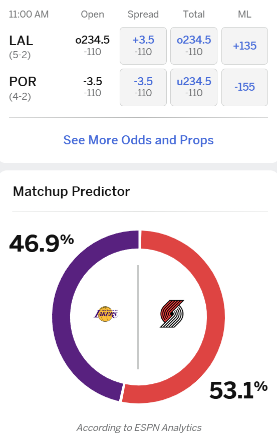 ESPN预测开拓者明天胜率53.1%,湖人将首次身披新款宣言版球衣出战。10月28日,湖人108-122输给开拓者。