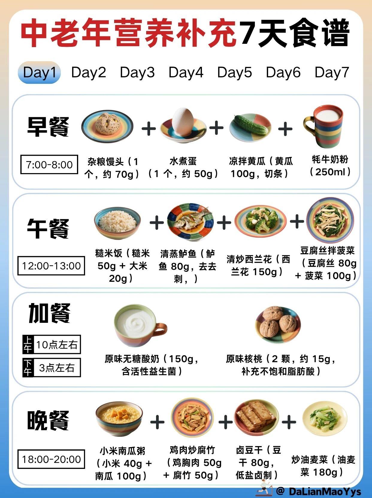 老年人深秋一周养生食谱 周一 - 早餐:小米粥、蒸山药、水煮蛋 - 午餐:杂粮饭、清炖羊肉汤、清炒西兰花 - 晚餐:燕麦粥、清蒸鲈鱼、凉拌菠菜 周二 - 早餐:南瓜粥、全麦馒头、凉拌海带丝 - 午餐:红薯饭、番茄炖牛腩、蒜蓉油麦菜 - 晚餐:大米粥、红烧排骨、清炒荷兰豆 周三 - 早餐:红枣粥、鸡蛋羹、小份凉拌黄瓜 - 午餐:燕麦饭、菌菇炖鸡汤、清炒胡萝卜丝 - 晚餐:玉米粥、清蒸虾、炒油麦菜 周四 - 早餐:核桃粥、全麦面包、水煮蛋 - 午餐:杂粮饭、萝卜炖排骨、清炒芥兰 - 晚餐:小米粥、酱牛肉、凉拌黄瓜 周五 - 早餐:百合粥、蒸红薯、小份凉拌番茄 - 午餐:大米饭、清炖鸡汤、清炒西兰花 - 晚餐:燕麦粥、红烧鱼块、炒菠菜 周六 - 早餐:山药粥、鸡蛋饼、凉拌海带丝 - 午餐:红薯饭、土豆炖牛腩、清炒荷兰豆 - 晚餐:玉米粥、清蒸鲈鱼、凉拌黄瓜 周日 - 早餐:红枣小米粥、全麦馒头、水煮蛋 - 午餐:杂粮饭、菌菇排骨汤、清炒胡萝卜丝 - 晚餐:大米粥、酱鸡腿、炒油麦菜 祝您健康快乐!秋冬养生食谱 老人营养食谱