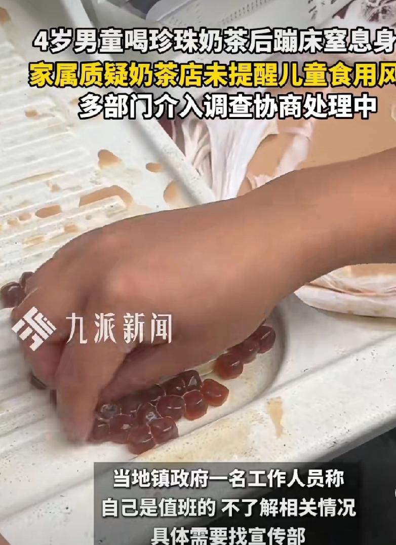 一颗珍珠引发的悲剧:4岁男童在游乐场的生命终点”2025年10月24日,浙江台州临海,一场看似平常的家庭娱乐变成了令人心碎的悲剧。在繁忙的宝龙广场,年仅4岁的男孩在喝完珍珠奶茶后,天真地在蹦床上玩耍,却不料珍珠卡喉,窒息的瞬间令人心揪。救援来得太迟,生命永远定格在童年的纯真时光。家属愤怒质疑:为何没有明显的安全警示?为何没有提醒孩子远离易卡喉的食物?奶茶店回应称,已在小程序中加入“儿童和老人需在监护下食用”的提示,但似乎还不足以防止悲剧重演。这起事件引发公众对儿童安全的深刻反思,也让人们关注公共场所责任与安全措施的落实。生命无价,每一份警醒都值得我们铭记